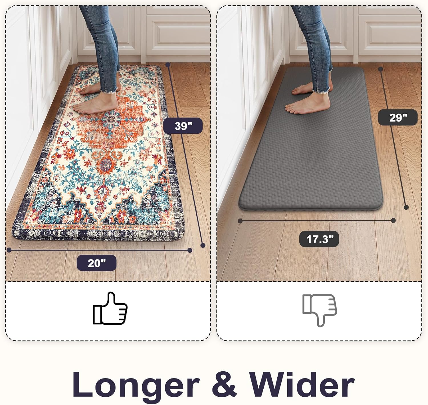 Non-Slip Kitchen Rug: Equipped with a padded non slip bottom so that the standing mat stays in place both on hard and carpet floors.Fully protect you and your family’s safety when you use this rubber backing mat.Tip:The effect will be better if you use the non skid mat on dry ground
