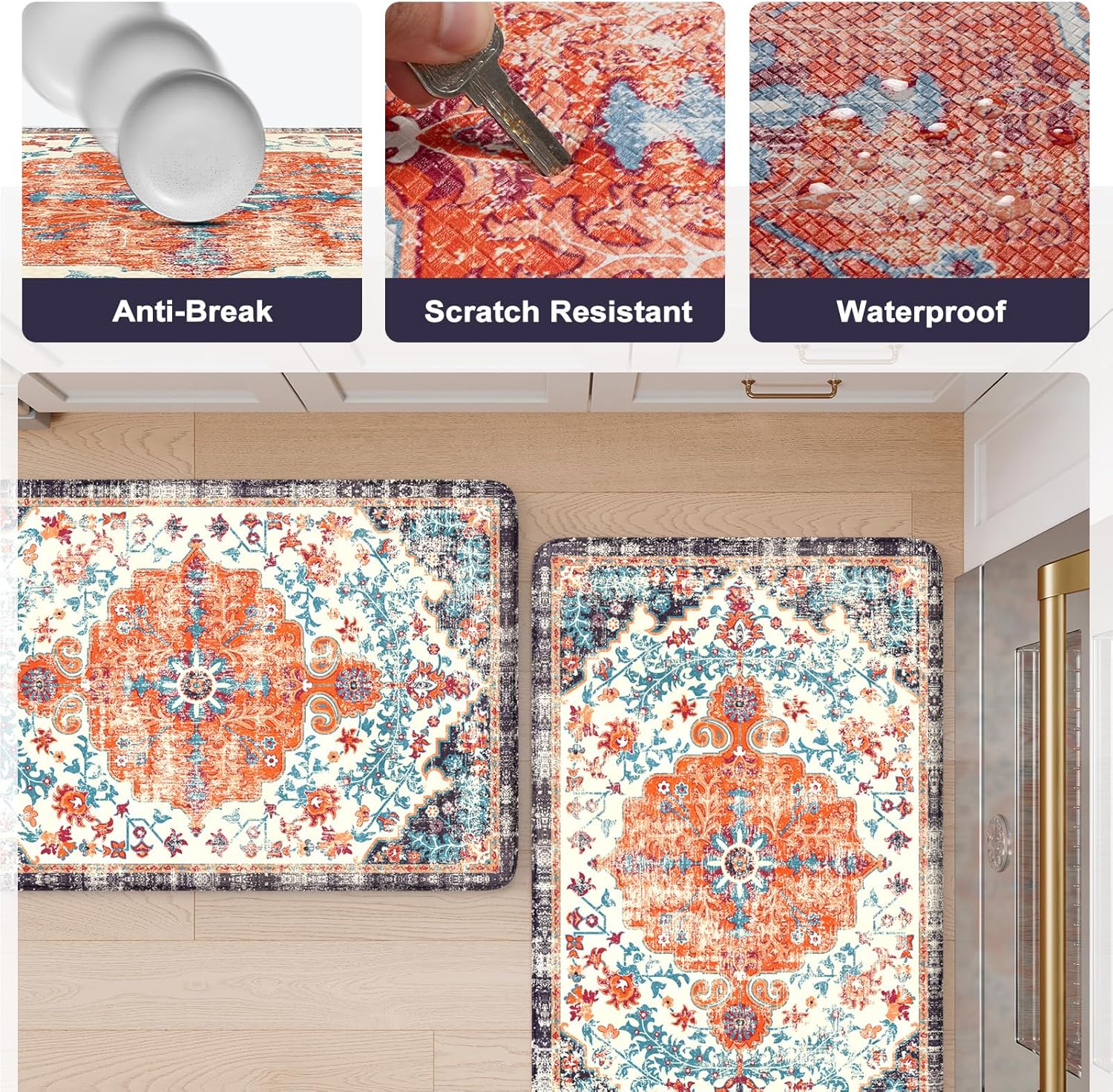 Versatile: Boho style design features a central medallion and floral motifs in the style of rugs,easily to match your kitchen decor.Soft thick foam provides ample support for standing in kitchen sink, laundry room, office, bathroom, dinning room, or any other high-traffic area