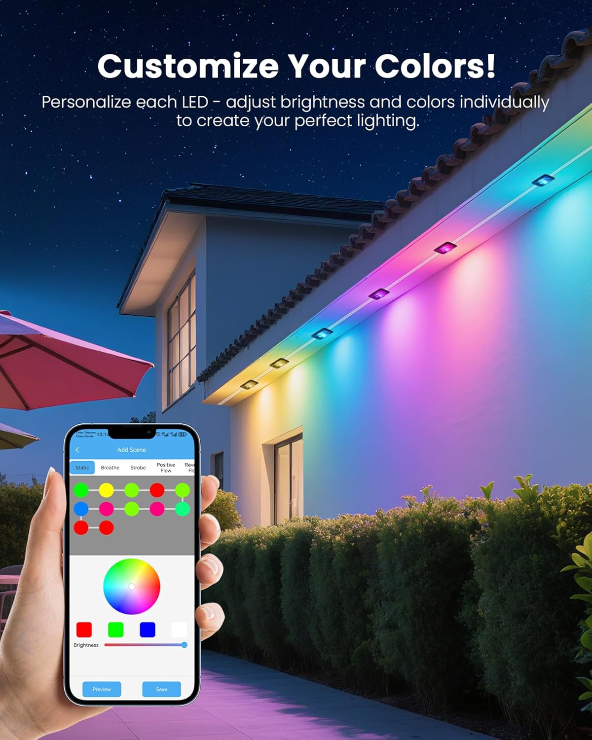 221 Lighting Modes & 16M Colors – Enjoy endless customization with RGB+ WS2811+IC technology! Switch between warm white, cool white, or 16 million vibrant colors—ideal for outdoor house lights that set any mood.