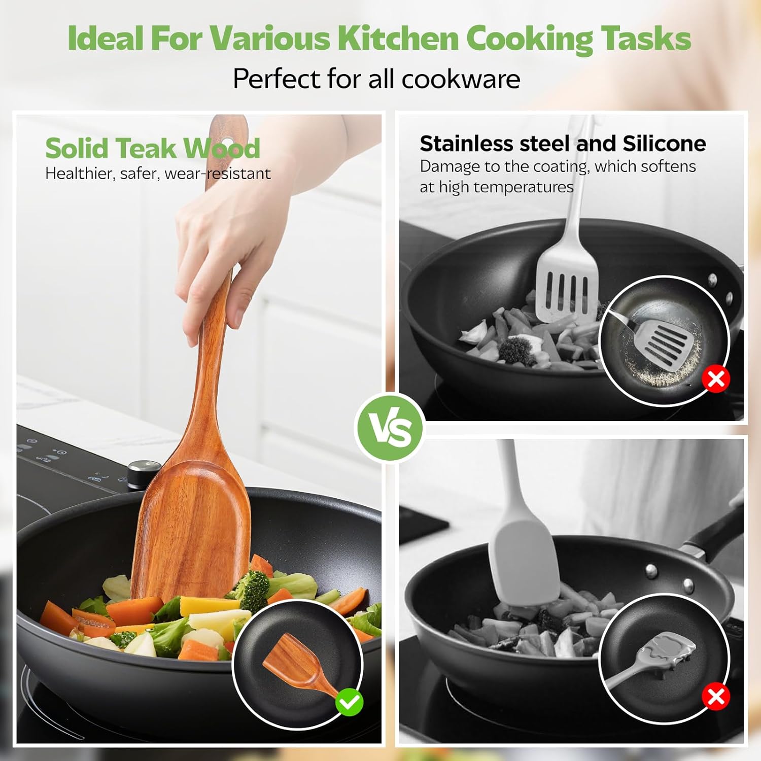BPA-Free & Eco-Friendly Wooden Kitchen Tools: Made from natural teak wood, this wooden utensil set is heat-resistant, non-toxic, and free from harmful chemicals, making it a safer choice for everyday cooking