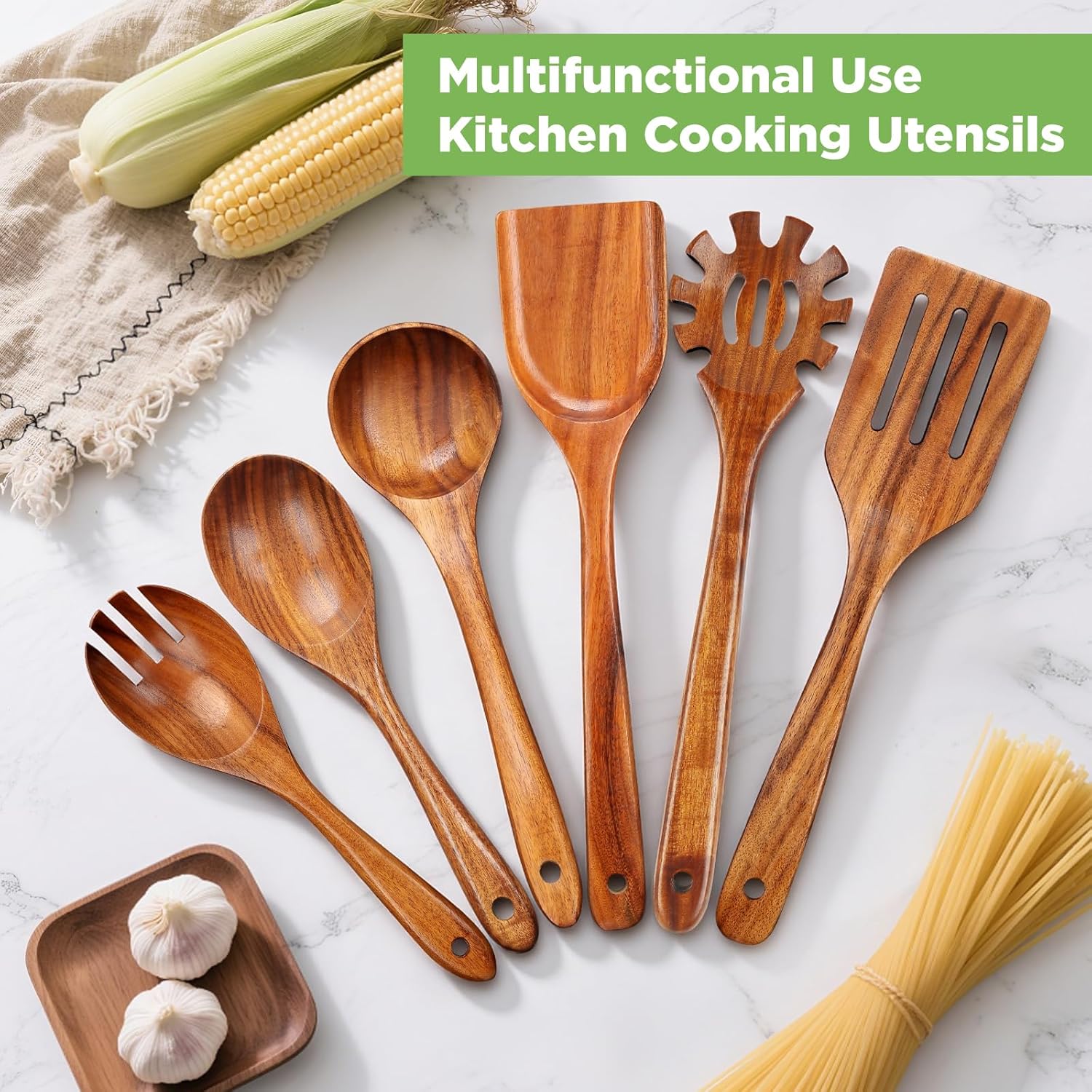Premium 6-Piece Wooden Utensil Set for Cooking & Serving: This wooden kitchen utensil set includes a wooden spatula for cooking, ladle, pasta spoon, salad fork, and more—all crafted from natural, heat-resistant teak wood for durability and safe use with non-stick cookware