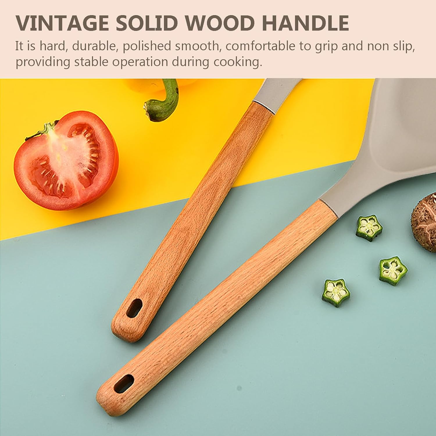 Kitchen Cooking Utensils Set, 7PCS Non-Toxic Silicone Cooking Tools Set with Wooden Handle, Non-stick Cookware Friendly Kitchen Gadget Set with holder, Includes Spatula/Turner/Spoon/Tongs (Khaki)