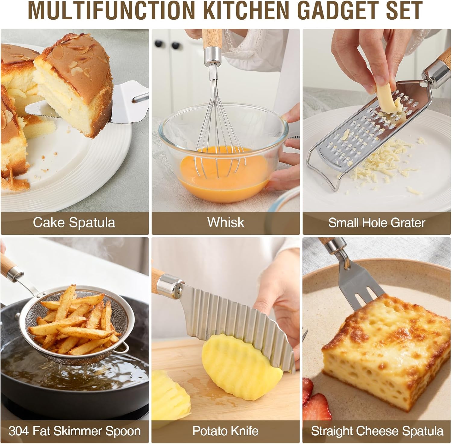 Kitchen Gadget Set, 6 PCS Stainless Steel Kitchen Utensil Set with Wooden Handle, Multi-Functional Cooking Utensil Gadget Tools for Baking, Cooking, Ideal for Cooking Enthusiasts & Newlyweds
