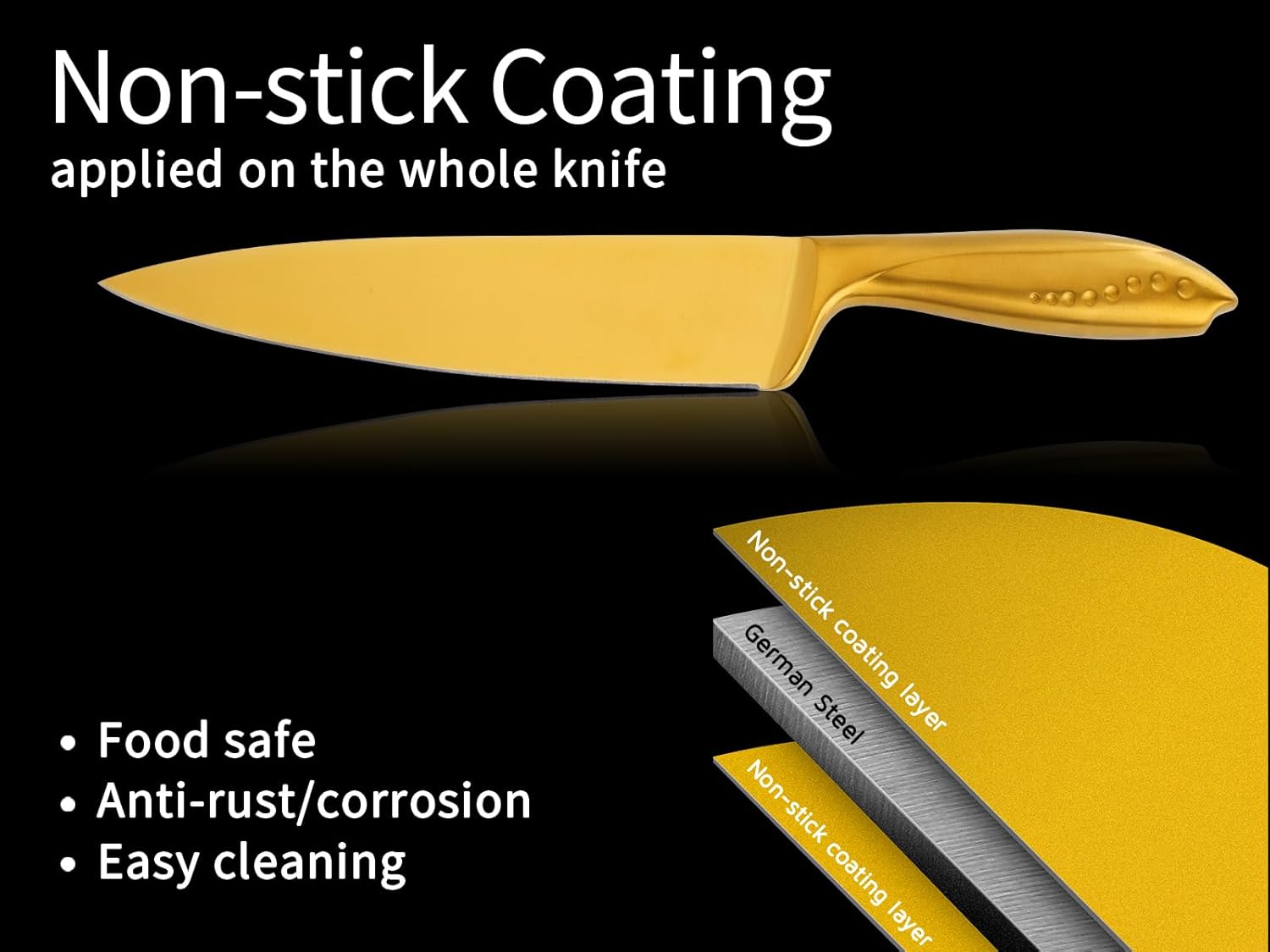 【NON-STICK COATING】The kitchen knife is processed with non-stick coating on the whole surface of the knife. This nonstick coating improves the knife’s corrosion resistance and enhances its non-stick properties and features easy cleaning.