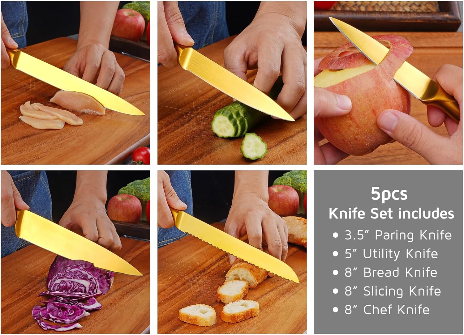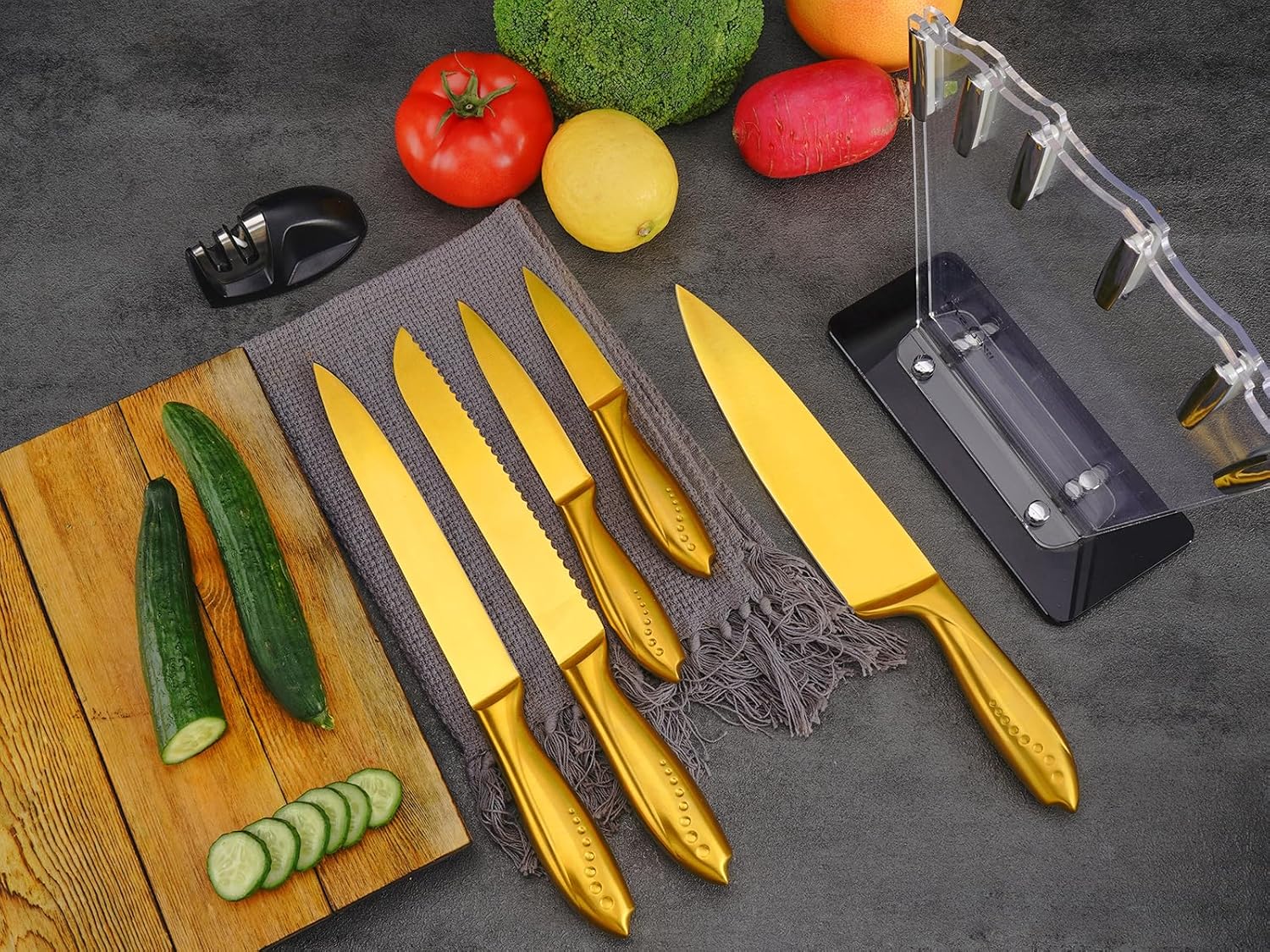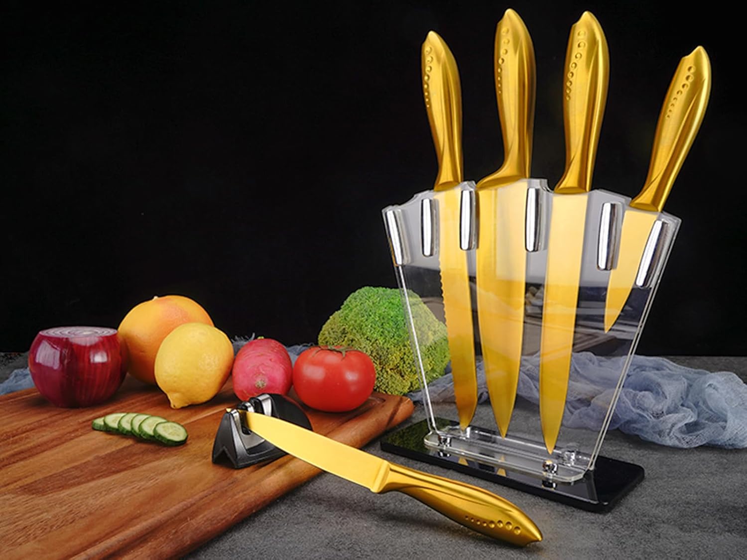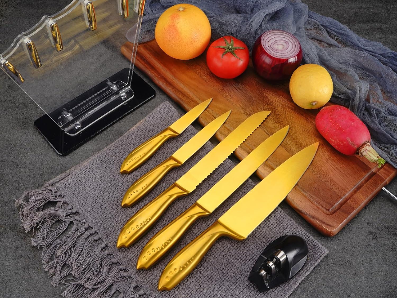 【7 PIECE VALUE SET】7 pieces knife acrylic stand set includes 8” Chef Knife, 8” Slicing Knife, 8”Bread Knife, 5” Utility Knife, 3.5” Paring Knife, 2-stage mini knife sharpener and clear acrylic knife block holder. This rainbow knife holder set comes with a beautiful color box, it is very suitable as a gift (Christmas, New Year, Weddings, Birthdays, Housewarming) for culinary students, home cooks, professional chefs and more.