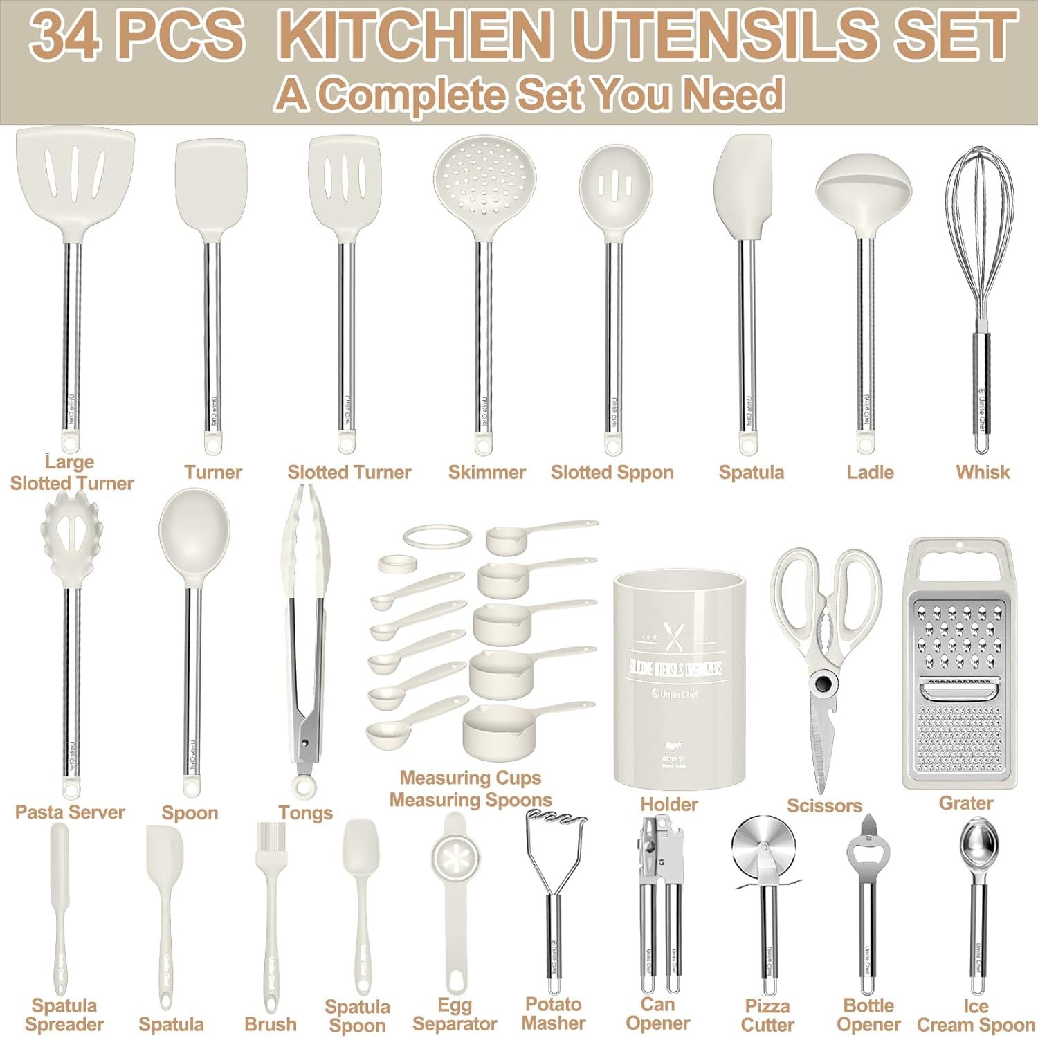 EVERYTHING YOU NEED From the everyday kitchen spoons to the garlic crusher, we included all the kitchen stuff you could possibly need to bring out your inner chef. This means you don’t have to spend extra money on repetitive utensil tools. This cooking utensils set includes Slotted Spatula, Slotted Spoon, Turner, Pasta Server, Solid Spoon, Kitchen Tongs and other kitchen tools such as Pizza Cutter, Grater, Can opener, Scissors and so on. Almost everything you need in a kitchen is in one box.