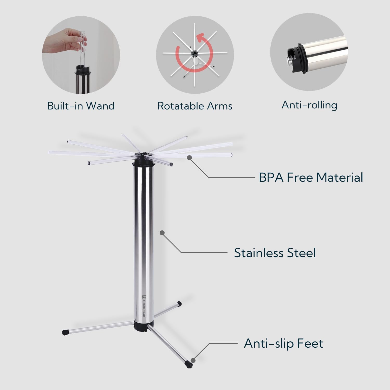 Quick Set-up & Rotary Arms: Set up this pasta stand within 10 seconds; The rotary rods makes it much easier to transfer the noodles. No need to move the pasta hanger continuously