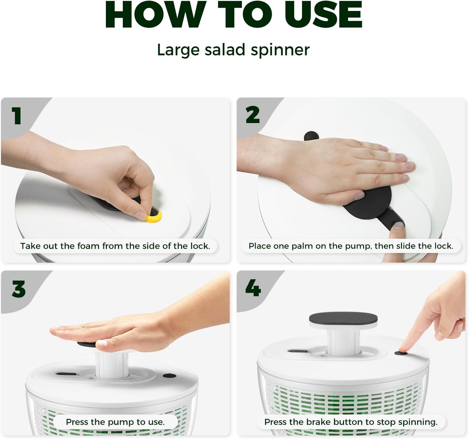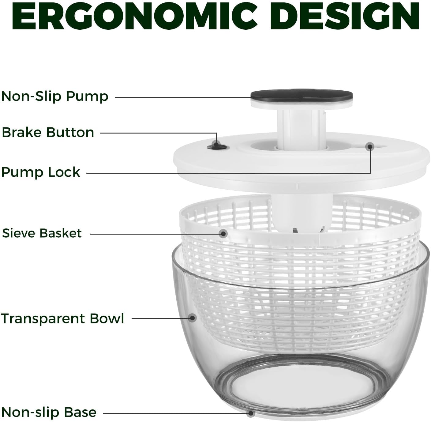 SO EASY&ONE-HANDED OPERATION: Simply press the brake button for a few seconds to dump and stop spinning. The non-slip ring and wide base keep the bowl stable on the countertop for enhanced operational safety. The salad/fruit dryer spinner is also designed with a convenient built-in pump handle lock for easy storage, saving more space in your kitchen.