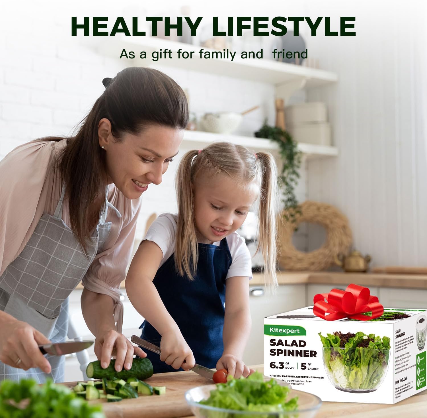 FAMILY SIZE SALAD SPINNER: The large salad spinner can help you cut down on busy cooking time and makes cooking a breeze. This lettuce spinner has a large 6.3Qt capacity bowl and a 5 qt basket, it can make 4-7 servings of salad at a time. The salad washer spinner and dryer can be used by one person or for the whole family/entertaining guests.