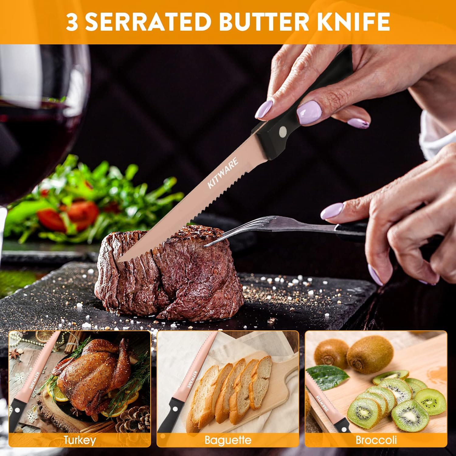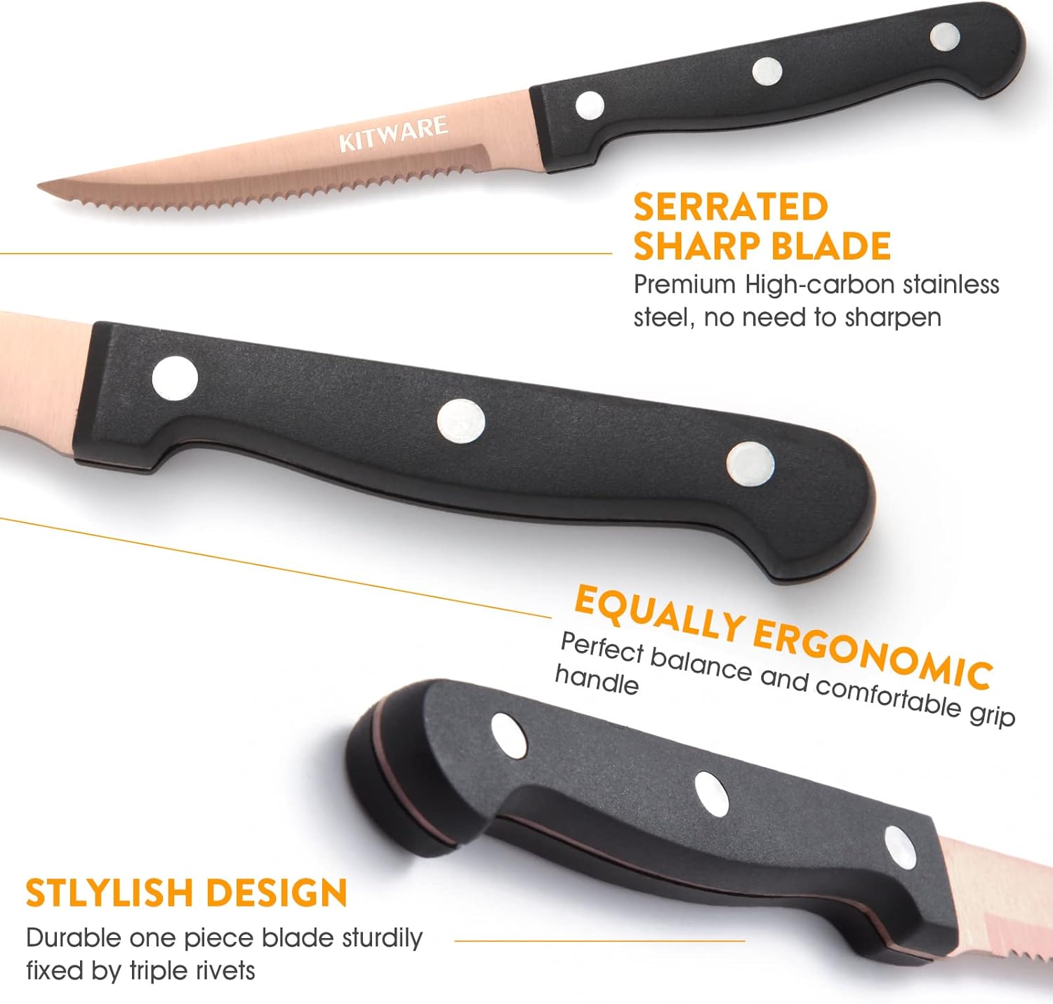 The 4.5 inch steak knives feature a razor sharp serrated edge blade that enable slicing steak/meat in ease.
