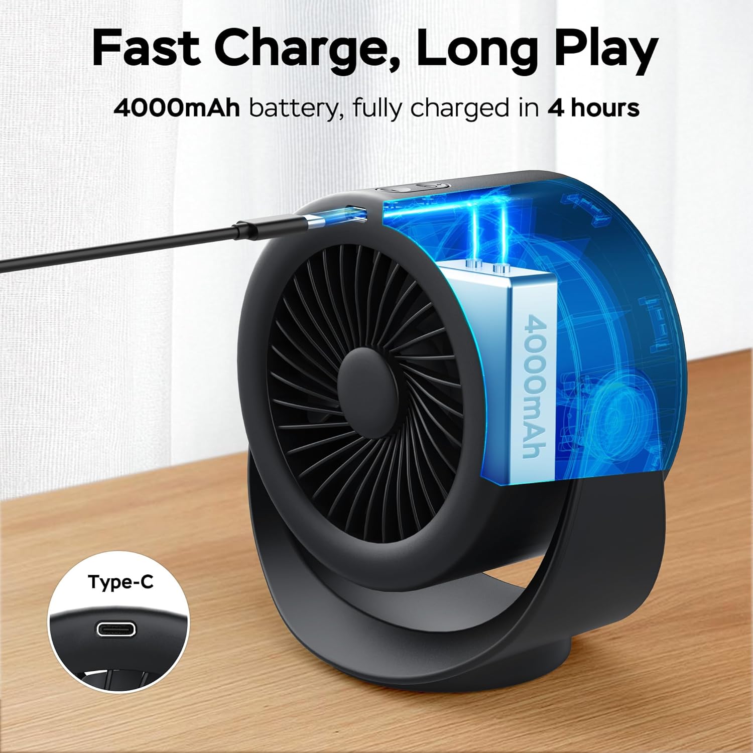 Long-Lasting & Fast Charging: KITWLEMEN table fan features a 4000mAh battery and Type-C fast charging (full in 4 hours). With 5 speed levels, enjoy up to 17 hours of cooling—perfect as a desk fan for work or a fan for bedroom at night
