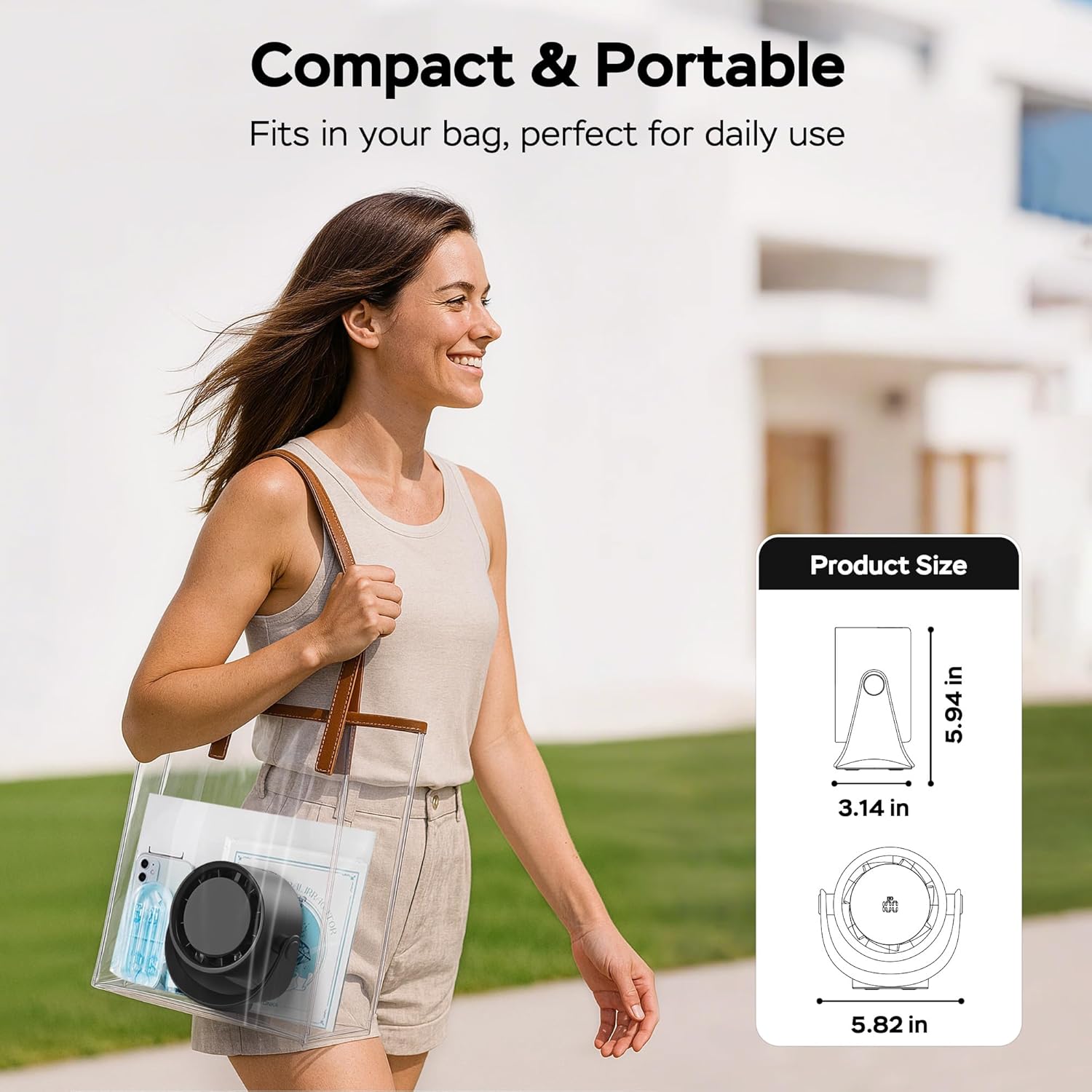 Compact & Travel-Ready: Its mini size (5.82*3.14*5.94 INCH) fits neatly on desks or nightstands. Toss it into your backpack or suitcase for portable cooling anywhere. The ultimate portable fan for home, office, or trips