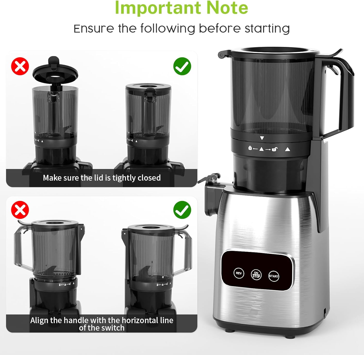 【Intuitive Touch Control & Reverse Function Juicer】Equipped with a premium touch-sensed panel, this cold press juicer machine features 3 simple settings (Off-On-Reverse) that are easy for all ages to use. The juicer’s reverse mode unclogs stuck ingredients instantly, avoiding downtime and ensuring continuous juicing — perfect for tough or fibrous produce.