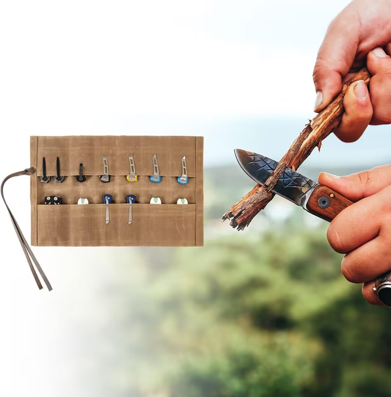 Good Quality Materials: Pocket Knife Display Is Handmade By Good-Quality Waxed Canvas, So The Pocket Knife Roll Is Indestructible And Can Be Used For A Long Time To Protector Your Knives From Damage And Store Hunting Knives. Butterfly Knives,Edc Pocket Knife And Other Tools Accessories