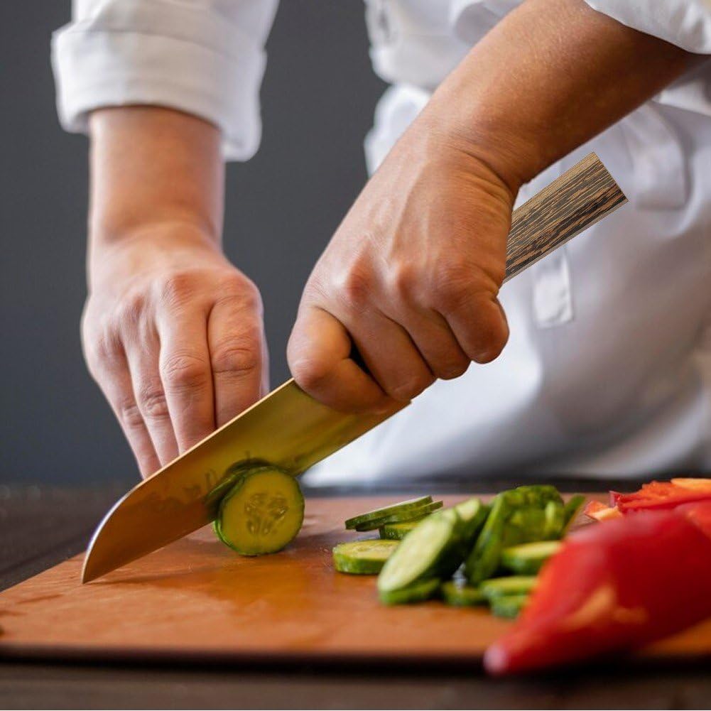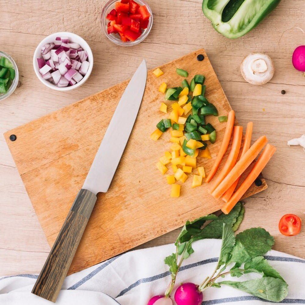 The kitchen knife handle is wood, polished smoothly without burrs, wont hurt your hands.