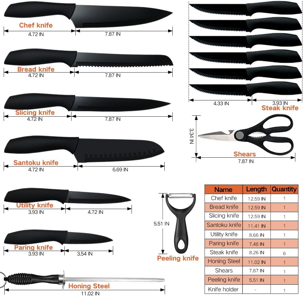 16 pieces knife set includes: 8″ Chef knife, 8″ Slicing knife, 7″ Santoku knife, 8″ bread knife, 5″ Utility knife, 3.5″ Paring knife, 6 Pcs 4.5″ serrated steak knife, kitchen shear, sharpener steel ,peeler and Knife Block.