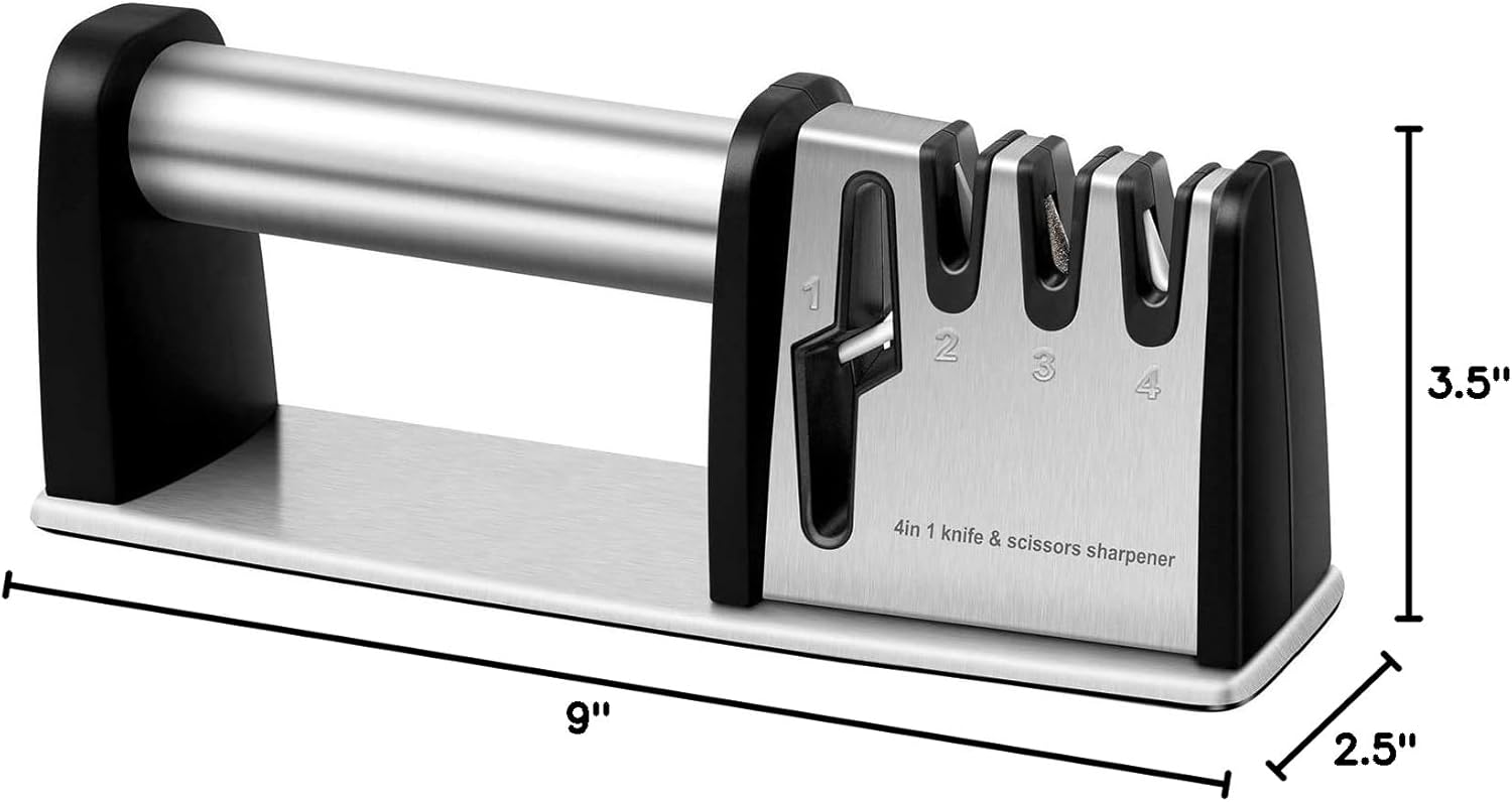 【4 Knife Sharpening Slots】Knife Sharpener has 4 Knife Sharpening Slots: ①Scissor slot: Made of ceramics, suitable for Scissors daily sharpening ②Coarse slot: Made of tungsten steel blades, suitable for grinding blunt knives. ③Fine slot: made of diamond grinding wheel, suitable for daily sharpening and also for the preparation stage of grinding knives. ④Exact-grinding slot: Made of ceramics, which is suitable for meticulous grinding and also for the finishing stage of the sharpening knife.