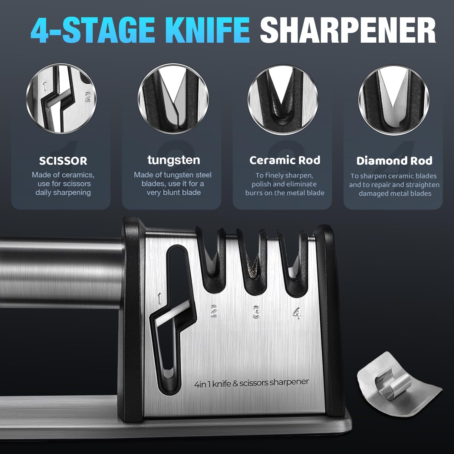 [ALL-INCLUSIVE KNIFE SHARPENER WITH 4- SLOTS]: Our knife sharpeners with 4-slots repairs your knives with varying degrees of bluntness effectively. Sharpen the scissors by scissors slot; Coarse slot is perfect for restoring the extremely blunt knife and blade re-shaping; While fine slot for daily sharpening; The last exact-grinding one for polishing and removing burrs.