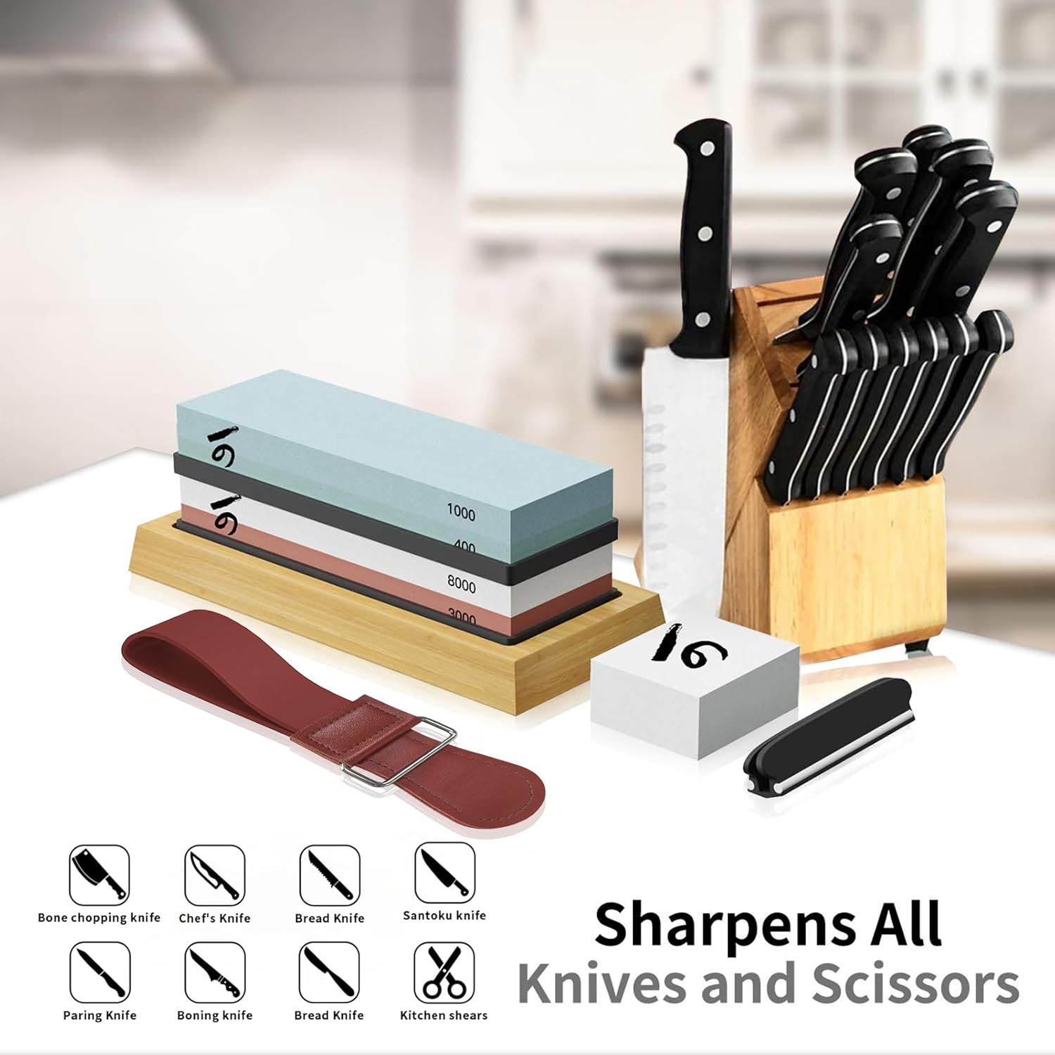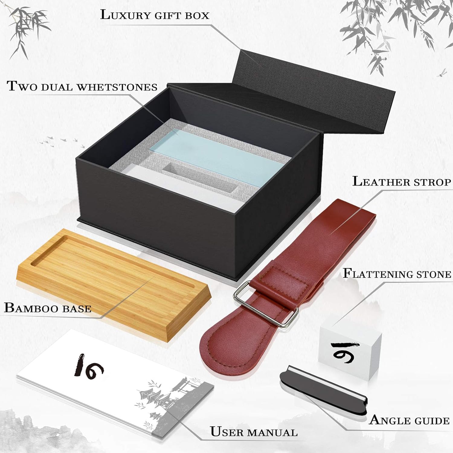 【Super Bundle】Your complete knife sharpening kit comes with two Double Sided Japanese Grit Whetstone 400/1000 & 3000/8000 with beautiful Non Slip wood base for holding the waterstone securely during the sharpening process; angle guide holds the knife on the correct angle; leather strop to polish knife and removing burr, flattening stone used for leveling, a pair of cut resistant gloves for protecting your hands, an instruction manual for learning sharpening skills