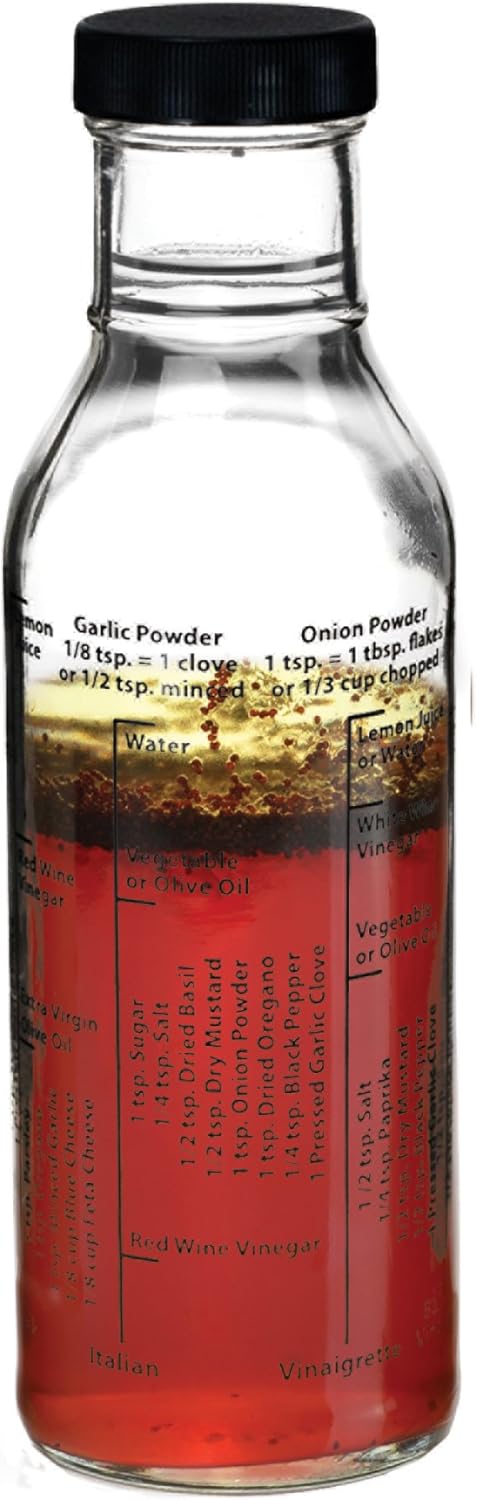 Kolder’s Salad Dressing Mixer Bottle creates tasty salad dressing recipes quickly and easily. Quick recipes and convenient measuring means super easy meals. Mix fresh dressings and toss salads right before serving or pass the bottle around the table to customize the amount used for each individual salad. Unlike the cruet that grandma used for mixing store-bought dressing packets, HIC’s Salad Dressing Mixer Bottle features 8 classic dressing recipes with precise measurements clearly printed right on the bottle for each fresh ingredient, rather than using pre-packaged powdered mixes. The permanent markings won’t ever fade or wear off and, it’s proudly made in America. The Mixer Bottle with airtight, leak-proof lid is the perfect airtight container to mix, serve, and store contents to keep them fresh between uses. Easily whip up a super-fresh classic Caesar or French dressing, Italian, Greek, Vinaigrette, Balsamic Vinaigrette, Honey Mustard or Asian dressing. Simply measure ingredients right into the bottle, cap, shake and pour. The dressings can also be used as sauces and marinades for meat, poultry, and produce for a more flavorful meal. The 13-ounce glass bottle. Proudly made in the USA, exclusively for HIC. Bottle and cap are dishwasher safe and Proposition 65 compliant. Set of 2