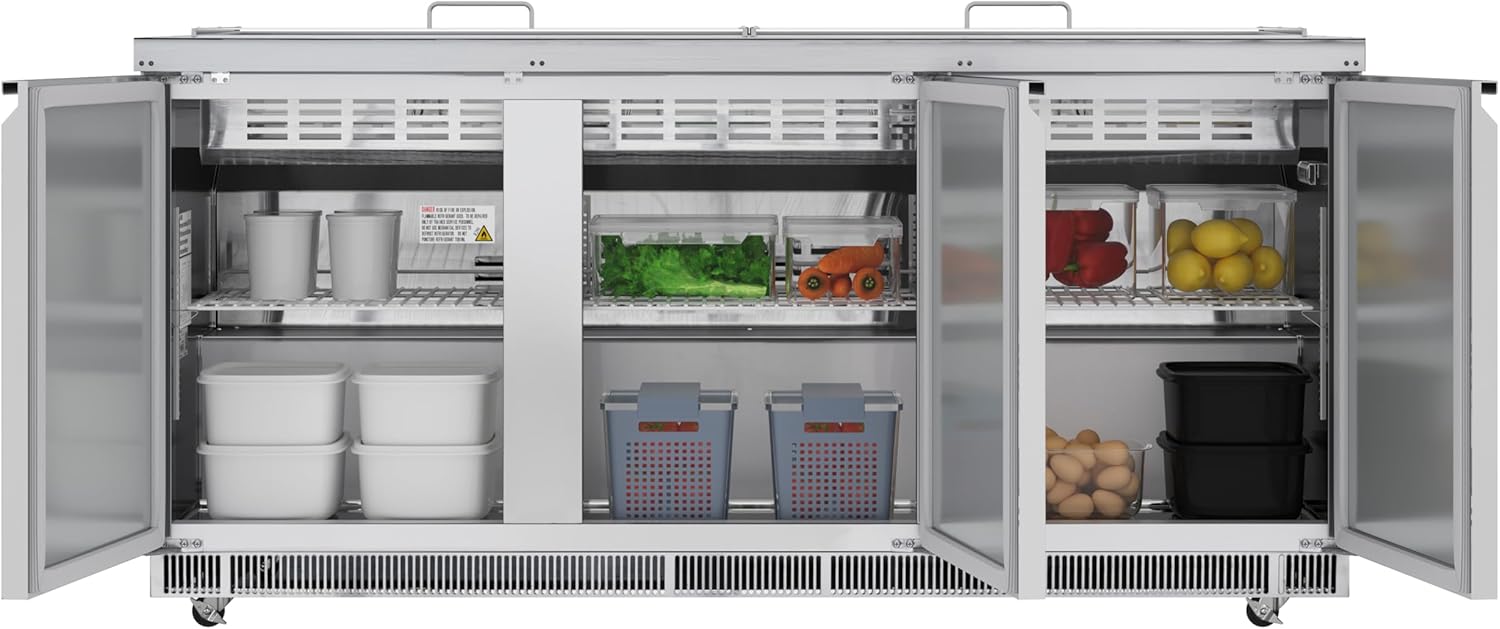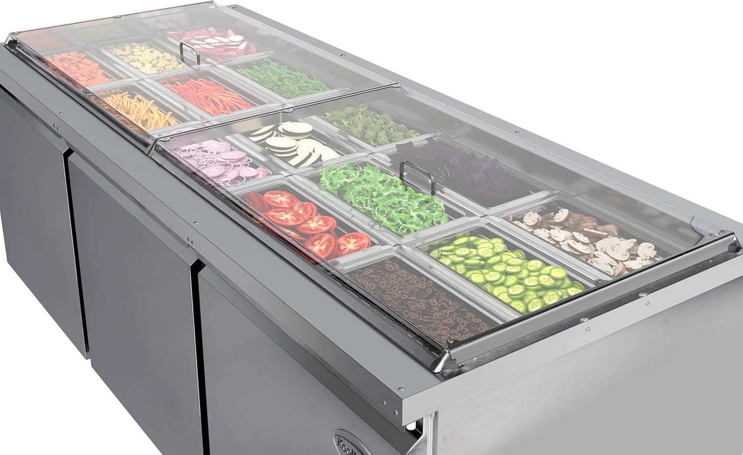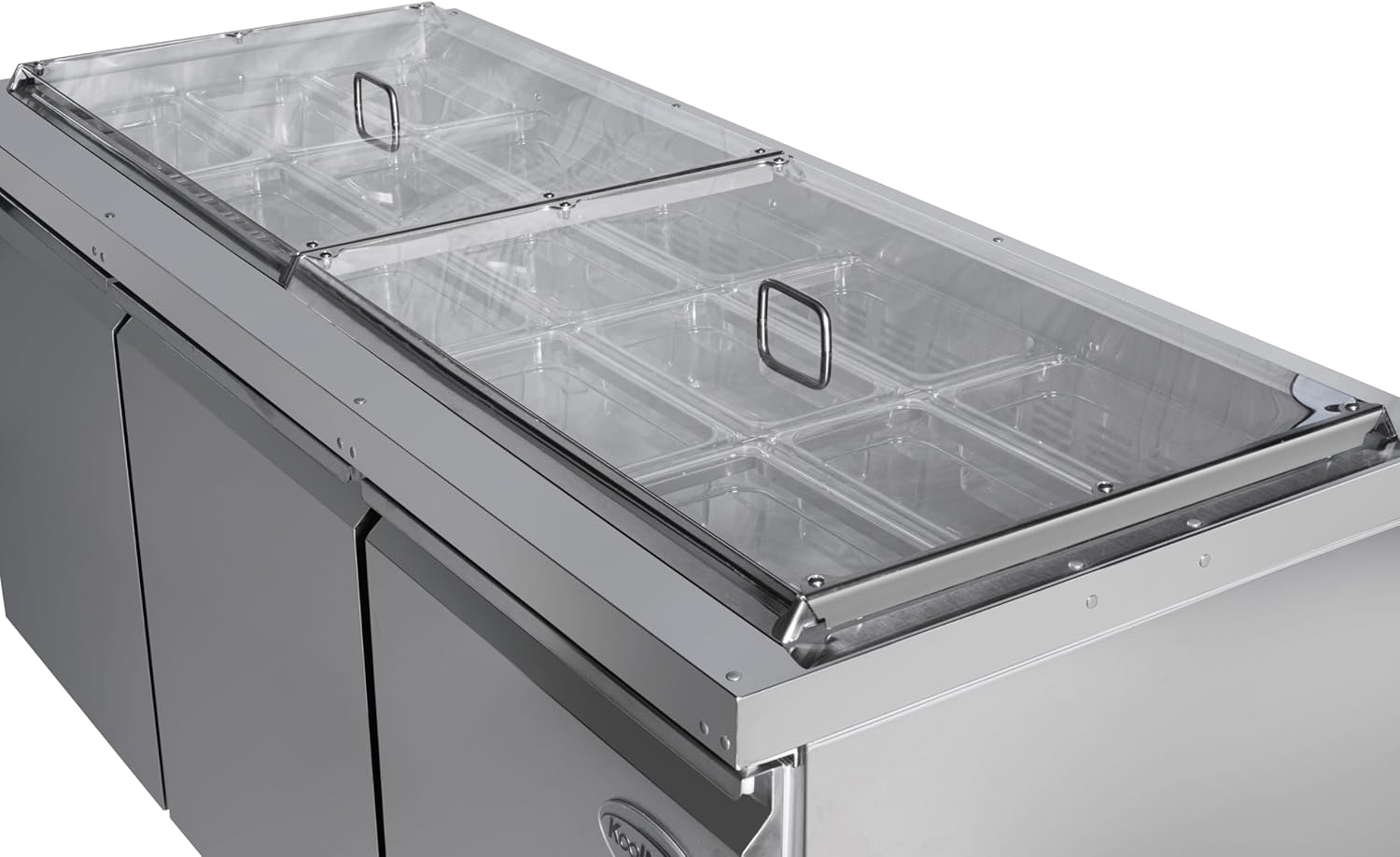 Multiple Versions to Fit Every Kitchen – We offer our refrigerator table with pan covers or with a sneeze guard and buffet tray slide to better fit your space, cooking needs, or customers. Choose the right above and enhance prep efficiency and safety.
