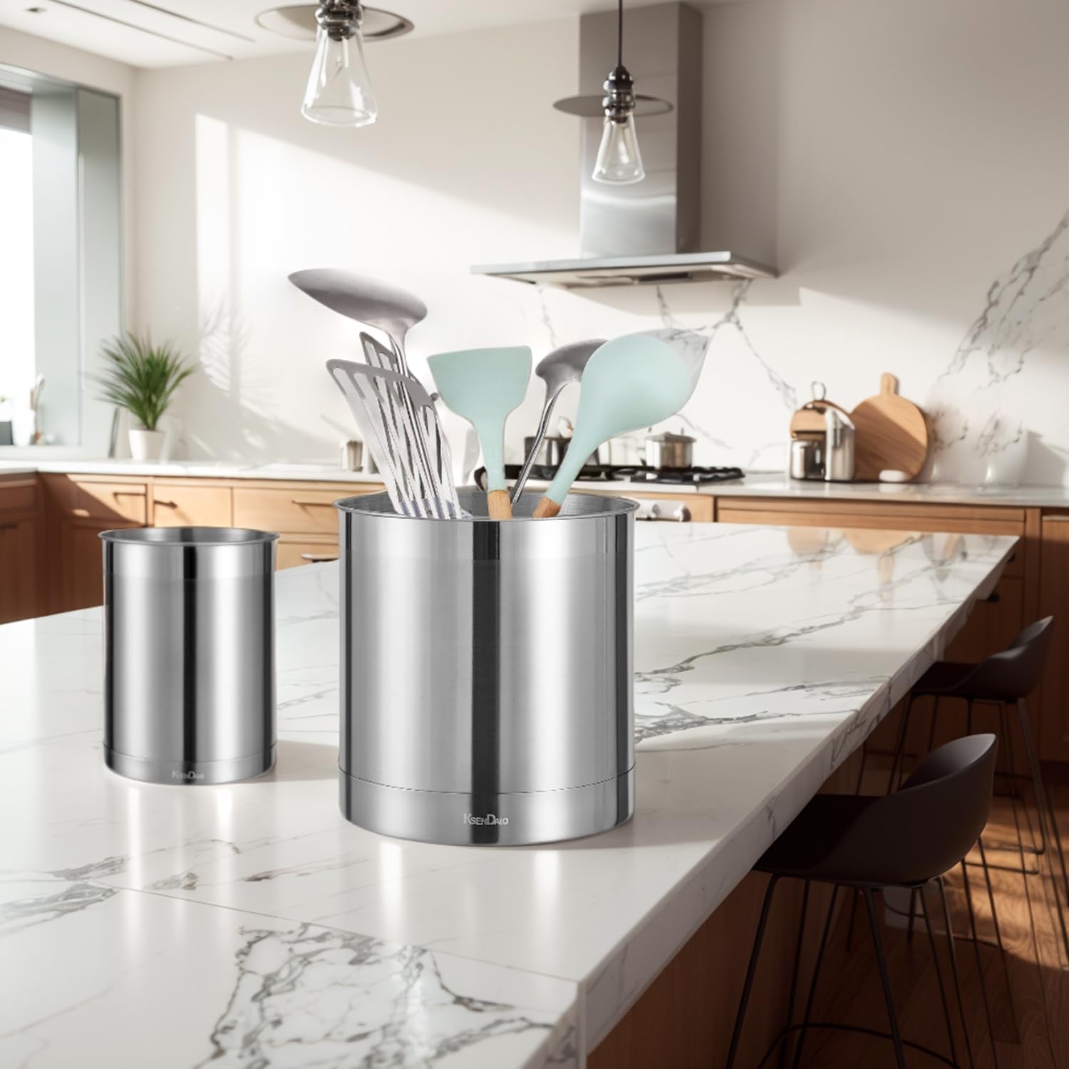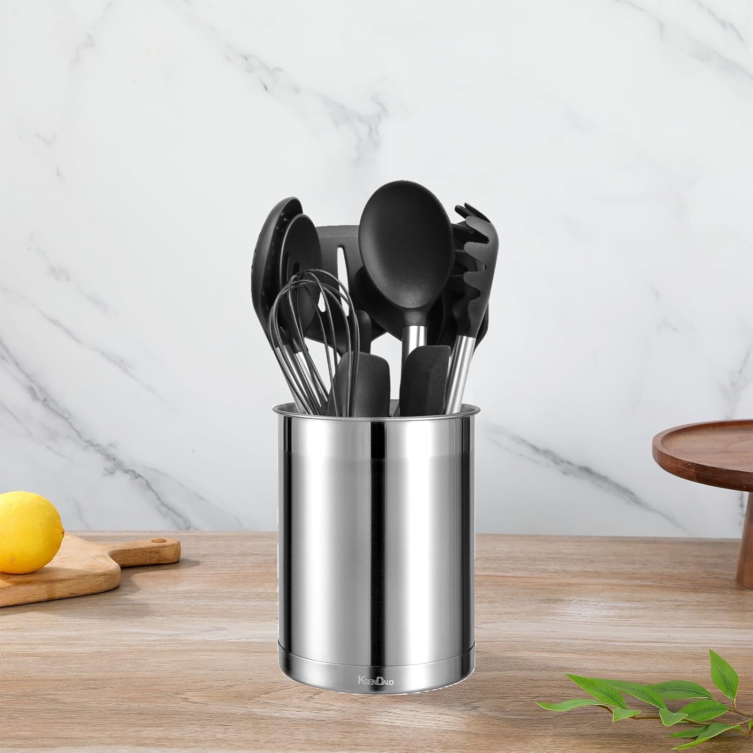 SAFE UTENSIL CROCK: Food-grade stainless steel with anti-rust oxidation finish (no plastic/coatings) organizes spatulas, tongs, and utensils vertically. Weighted double-layer base (5″W x 6.6″H) prevents tipping while enhancing modern aesthetics.