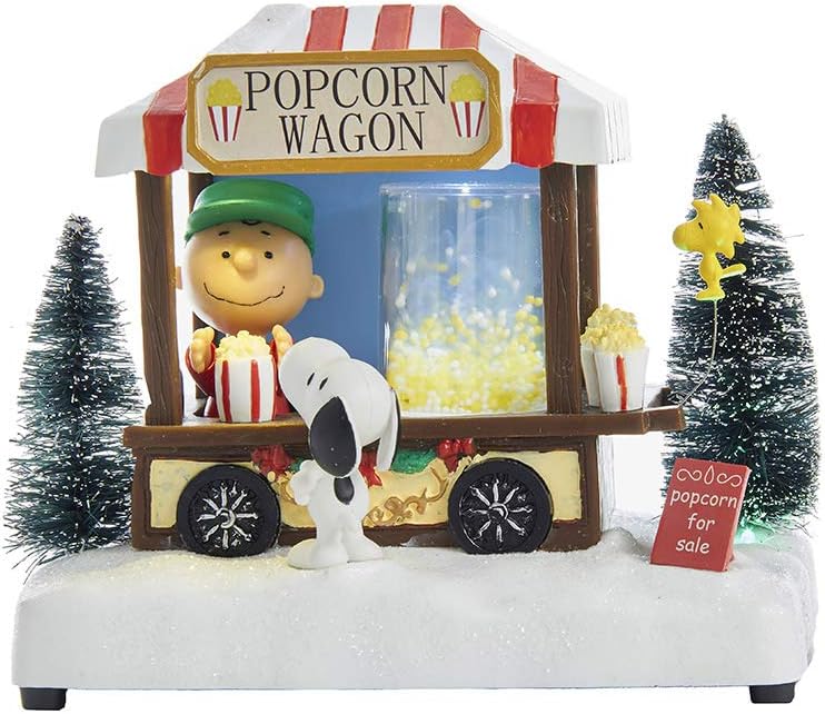 This 7-Inch Battery-Operated Peanuts LED Musical Table Piece from Kurt Adler is a fun and festive addition to any holiday décor! Perfect for Peanuts fans and collectors, this piece features Charlie Brown working the Popcorn Wagon, handing popcorn to Snoopy. Woodstock is in the background watching the scene unfold. When switched on, the wagon lights up and is open for business, the tree is illuminated, and the classic Charlie Brown music plays.