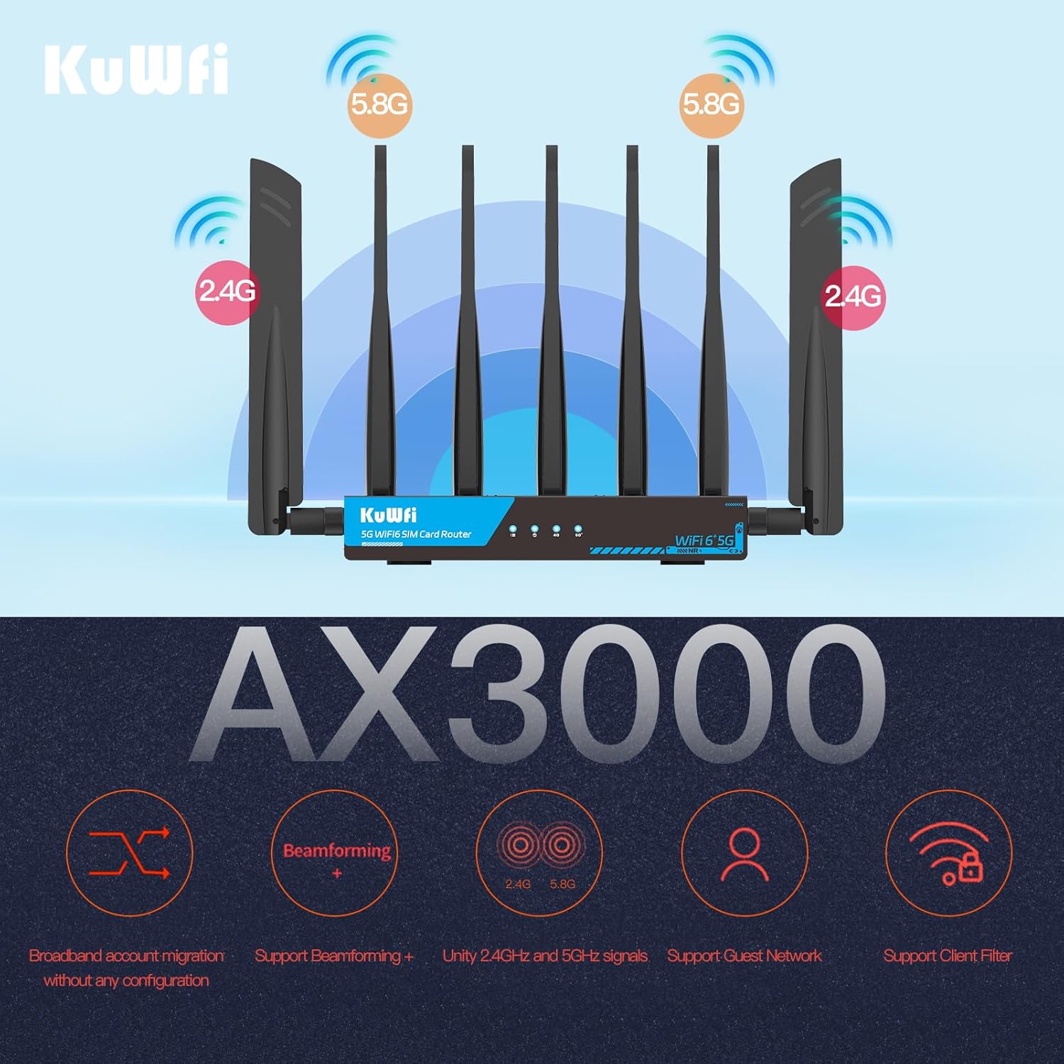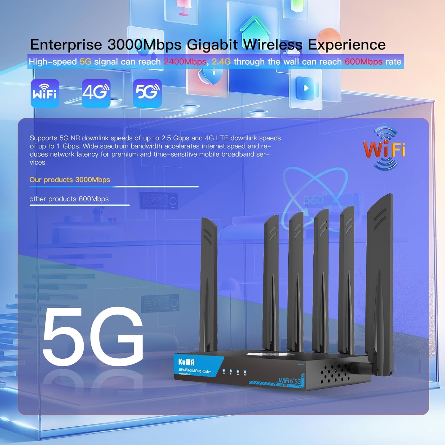 【What is KuWFi RM503Qpro】a 5G Router With SIM Card slots, 5G Modem suits to all network types all over the world, it means you just need to insert a SIM card and enjoy the ultra-fast broadband connection at any places. SDX62 5G NR SA / NSA Modem supports 5G NR downlink speeds of up to 2.5 Gbps and 4G LTE downlink speeds of up to 1 Gbps. Can be used as broadband backup for existing homes and RV needs