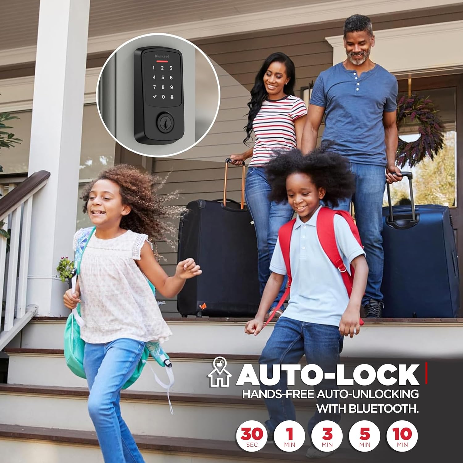 Bluetooth Connectivity to directly manage access codes, adjust lock settings, and share access with guests using the Kwikset app.