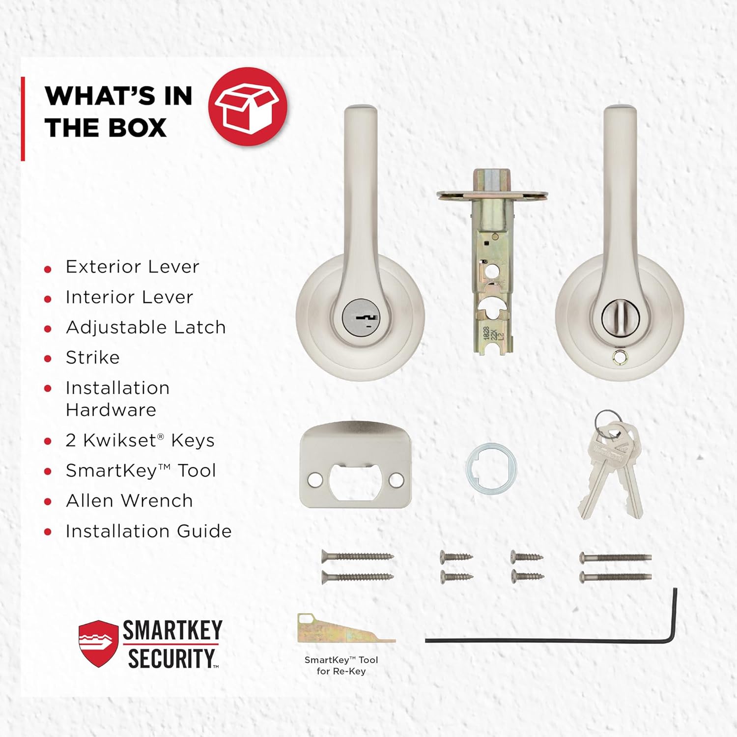 BOX INCLUDES: Keyed Exterior Lever, Interior Lever, Screws, Adjustable Latch, 2 Keys, Strike Plate, SmartKey Tool, Installation Hardware, Install Guide