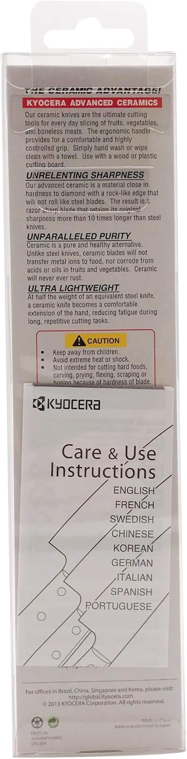 The Revolution Series 3″ Paring Knife is from Kyocera’s most popular line of advanced ceramic knives. Designed with a comfortable, ergonomic handle for precise control. The ceramic blades are made from a proprietary zirconia material produced in Japan and stays razor sharp at least 10 times longer than traditional knives, making them ideal for everyday use. The perfect choice for slicing fruits, vegetables and boneless meats. Not intended for frozen or hard foods. Kyocera advanced ceramic cutlery and kitchen tools are fully warranted to be free of defects in material and craftsmanship.