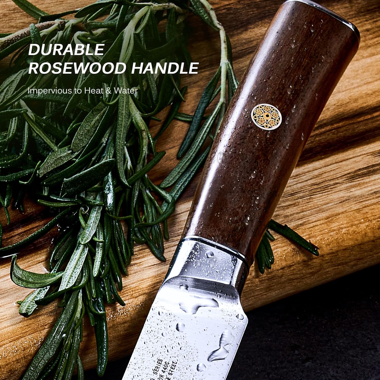 ULTRA-SHARP BLADE: Sharpened to a 13 to 15 degree edge, this kitchen knife delivers exceedingly precise cuts through meat, fish, fruit, vegetables, and more with negligible resistance; the steel’s 59-60 HRC strength provides unrivaled performance, superior corrosion resistance, and exceptional edge retention