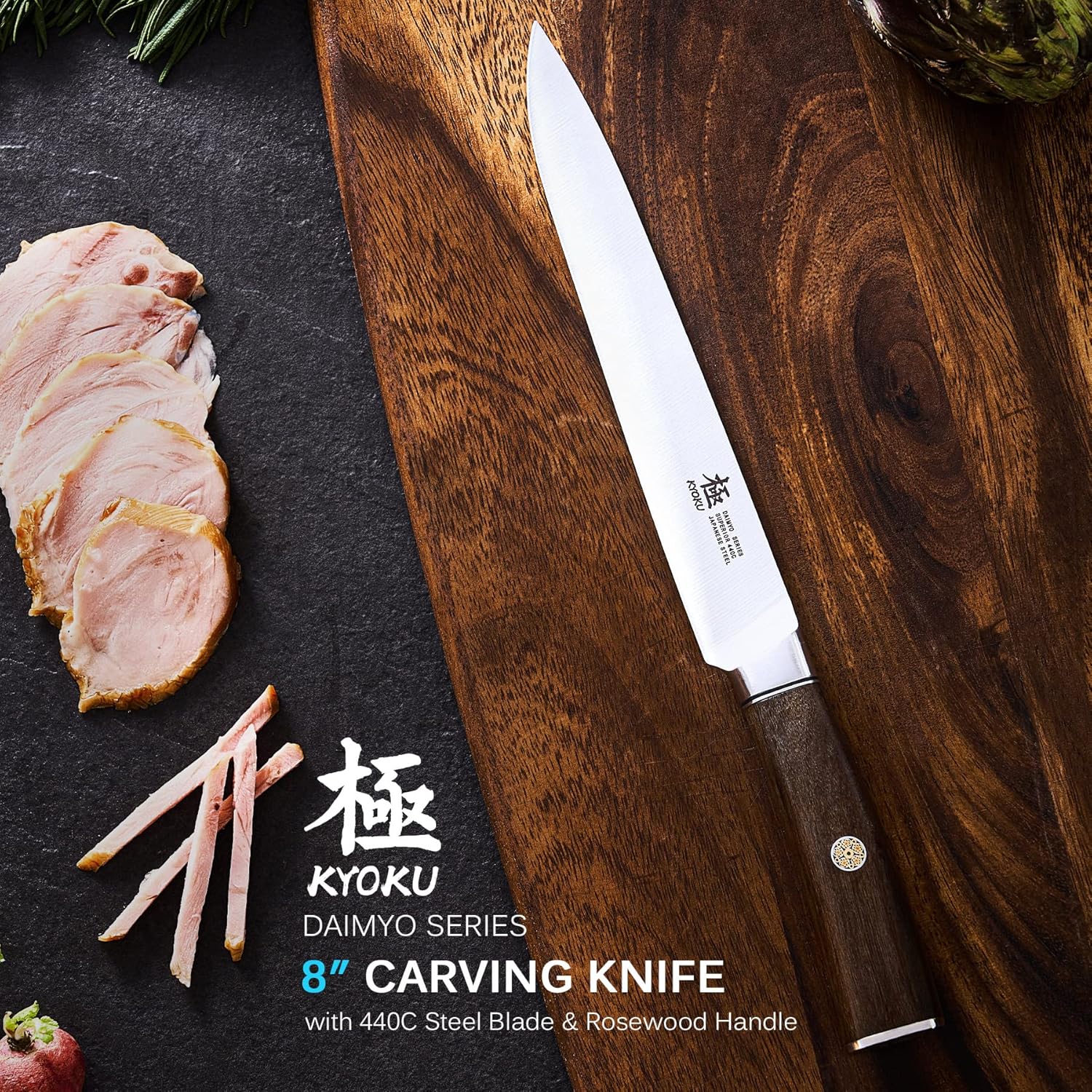 8″ CARVING KNIFE: This carving knife is part of Kyoku’s premier Daimyo series, manufactured with modern technology and traditional care and craftsmanship; its Japanese 440C stainless steel has been vacuum heat treated and paired with a perfectly balanced rosewood handle to offer superior precision and control to home chefs and culinary professionals alike