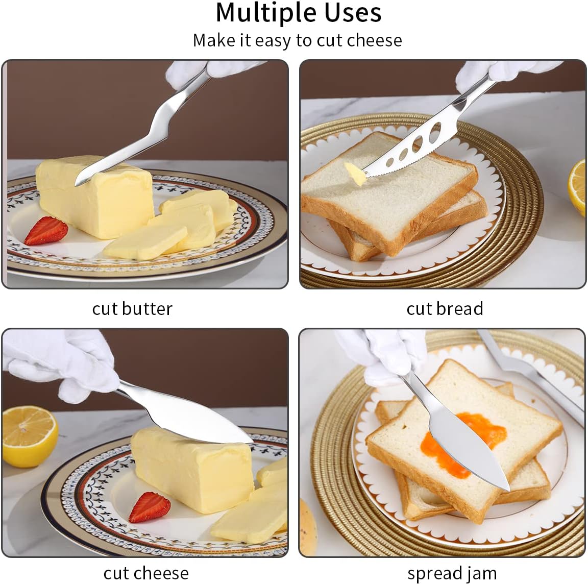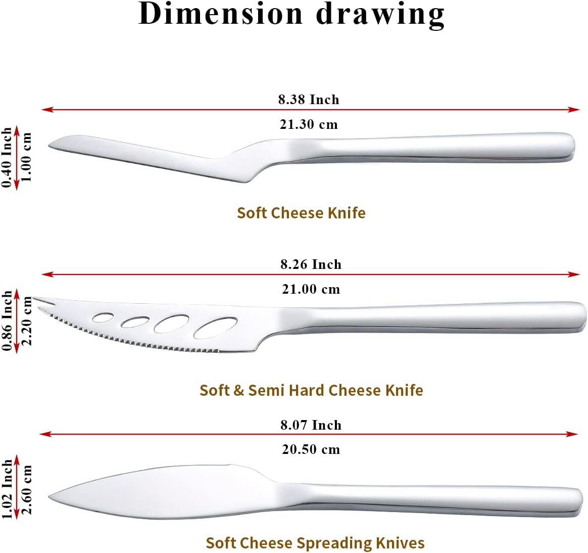 Kyraton Pack of 3 Pieces high quality stainless steel Cheese Knife Set.Made of premium high quality stainless steel, BPA free / lead free, Rust-resistant, sturdy and durable for years.Equipped with high quality stainless steel blades,this cheese knife set is suitable for cheese of various shapes and hardness. It is good for food lovers have a happy experience.This cheese knife set can be widely used in cheese making, daily cooking, birthday party, family gathering and outdoor party.Dishwasher safe: The cheese knife will stay sharp after repeatedly being washed in the dishwasher.