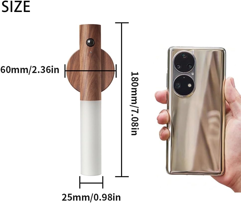 Material White Ash Wood+Acrylic / Black Walnut Wood+Acrylic Sensor Detection Distance 10 ft. Lighting Mode Motion Detection mode / Alway On mode Battery Capacity 500mAh lithium battery Light Source LED Light Brightness 2700K-3000K warm Motion Lighting Duration 15s (sensor mode) Color Black Walnut Wood / White Ash Wood