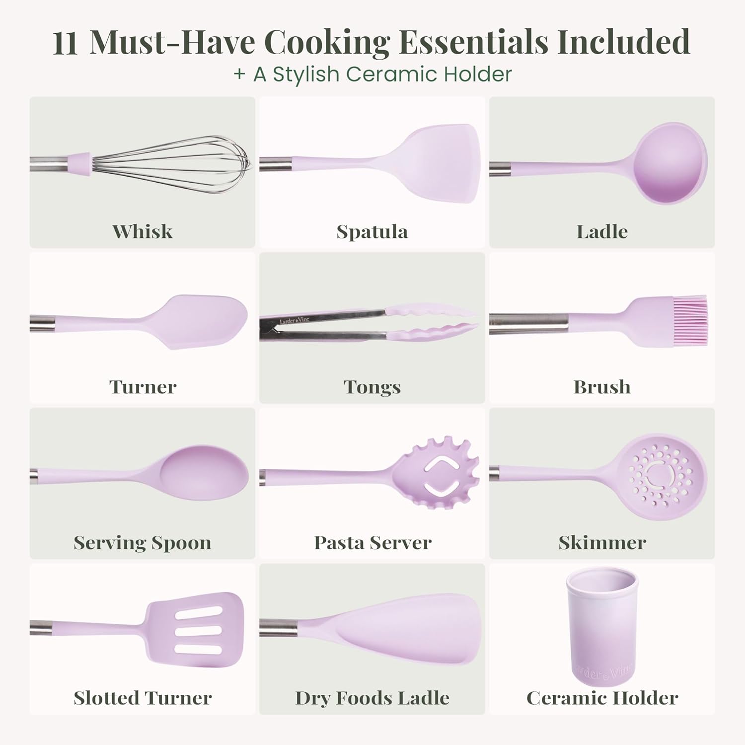 Complete Kitchen Essential: This 12-piece silicone utensil set meets all your cooking and baking needs, with tools for stirring, whisking, flipping, and more. Includes a ceramic crock for convenient countertop storage.