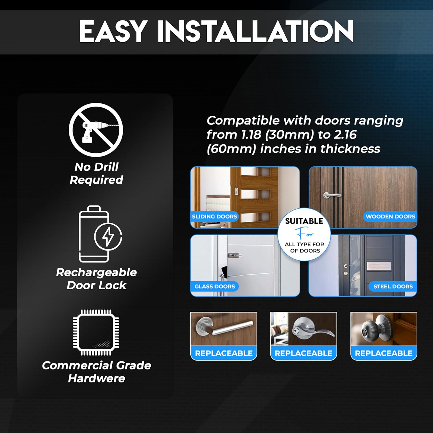 🔐 [𝐂𝐎𝐌𝐏𝐀𝐓𝐈𝐁𝐈𝐋𝐈𝐓𝐘] – With Doors ranging from 1.18” (30mm) to 2.16” (60mm) in thickness. Instruction manuals & user guides are bundled within the package for safe & easy installation – no drilling/wiring required