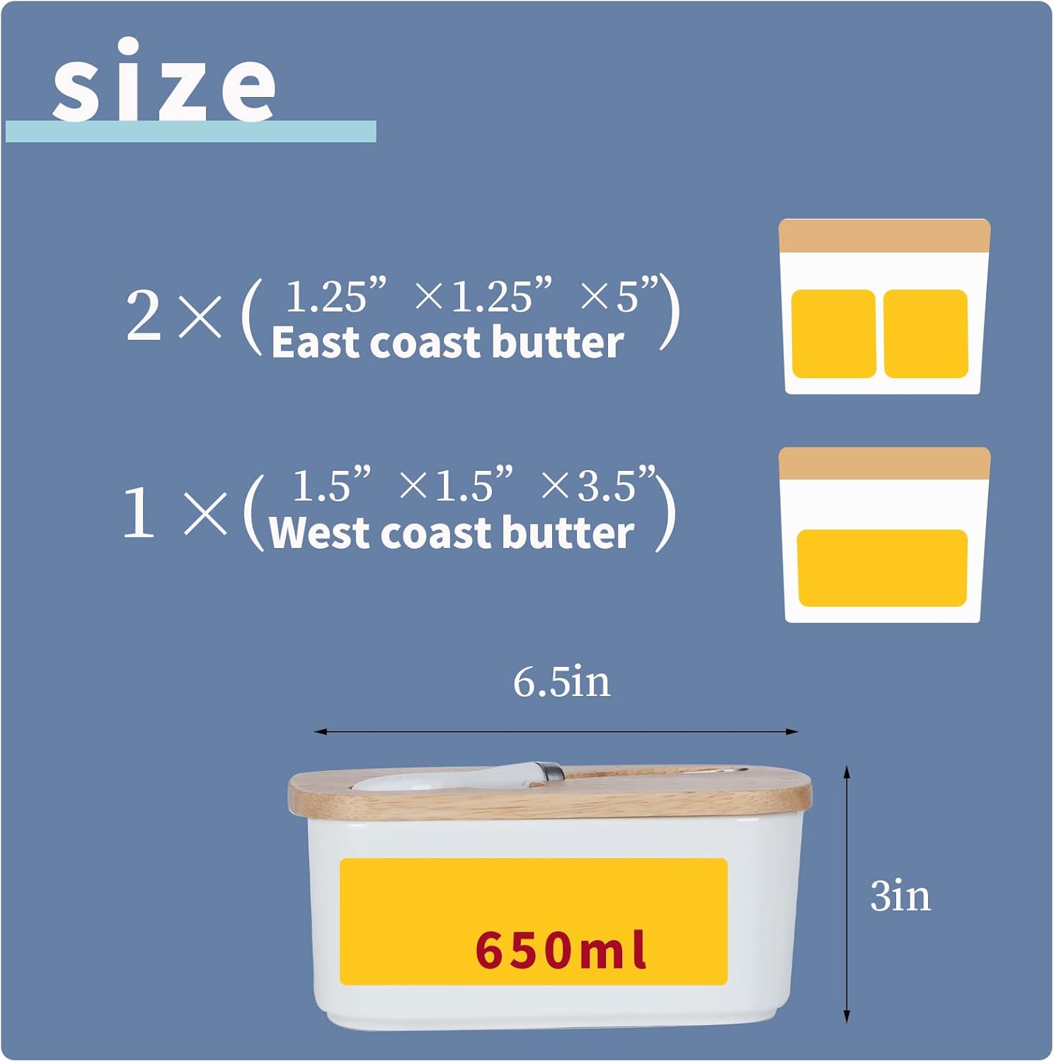 Porcelain design: This porcelain butter dish’s wide and deep enough to prevent butter from sticking to the top cover. It is enough to fix the STANDARD butter stick, East and West European coast Butter, it matches most butter brands