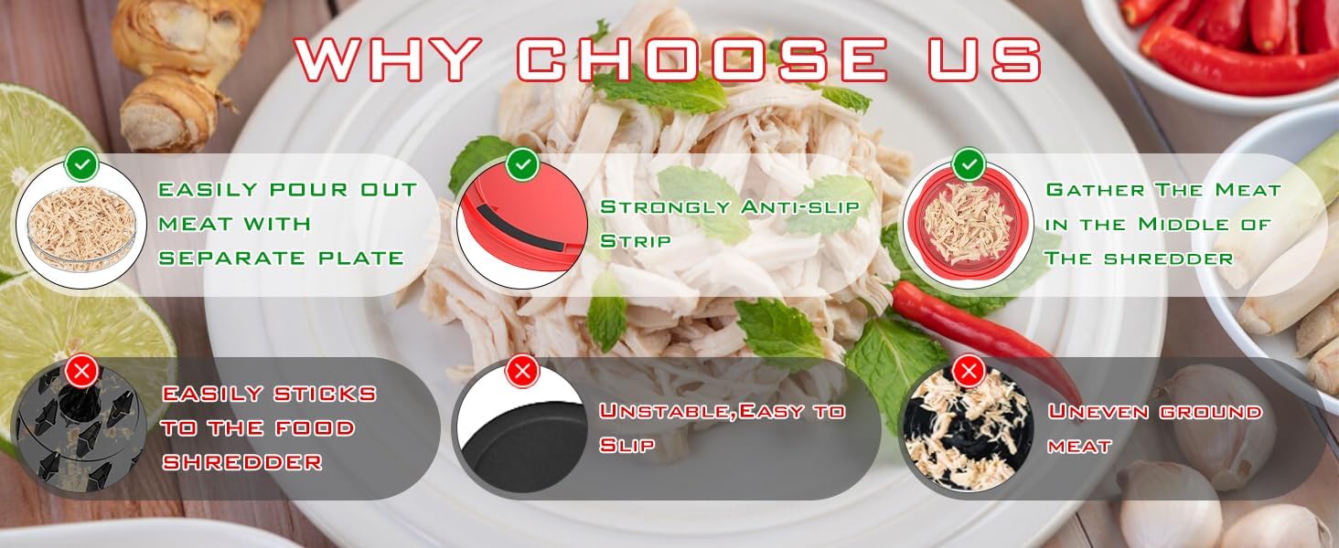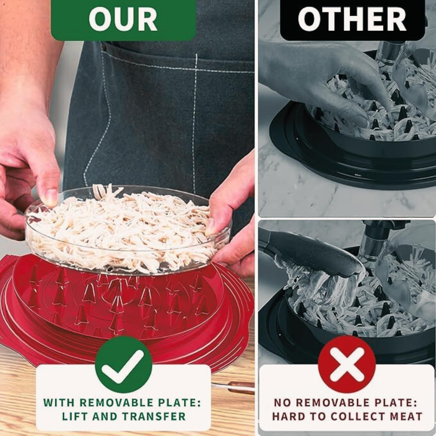 LONGER TEETH & 4 EXTRA SPIKES FOR PERFECT SHREDDING This chicken shredder tool comes with longer, sharper integrated teeth that cover the full surface area, delivering faster results with every twist. The additional four spikes ensure no meat gets stuck at the edges, allowing for even distribution and perfect chicken shredded texture every time. Paired with an ergonomic handle and sturdy anti-slip base, it’s the ideal tool for quick and effortless shredding.