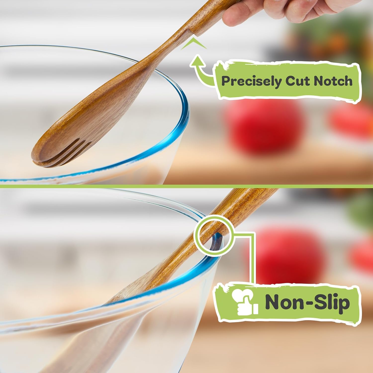 Innovative Notch Design on the Back of Acacia Wood Salad Serving Utensils: The unique notch design on the back of the wooden spoon ensures it rests securely on the edge of bowl and pans, preventing it from slipping into the food or onto the countertop.