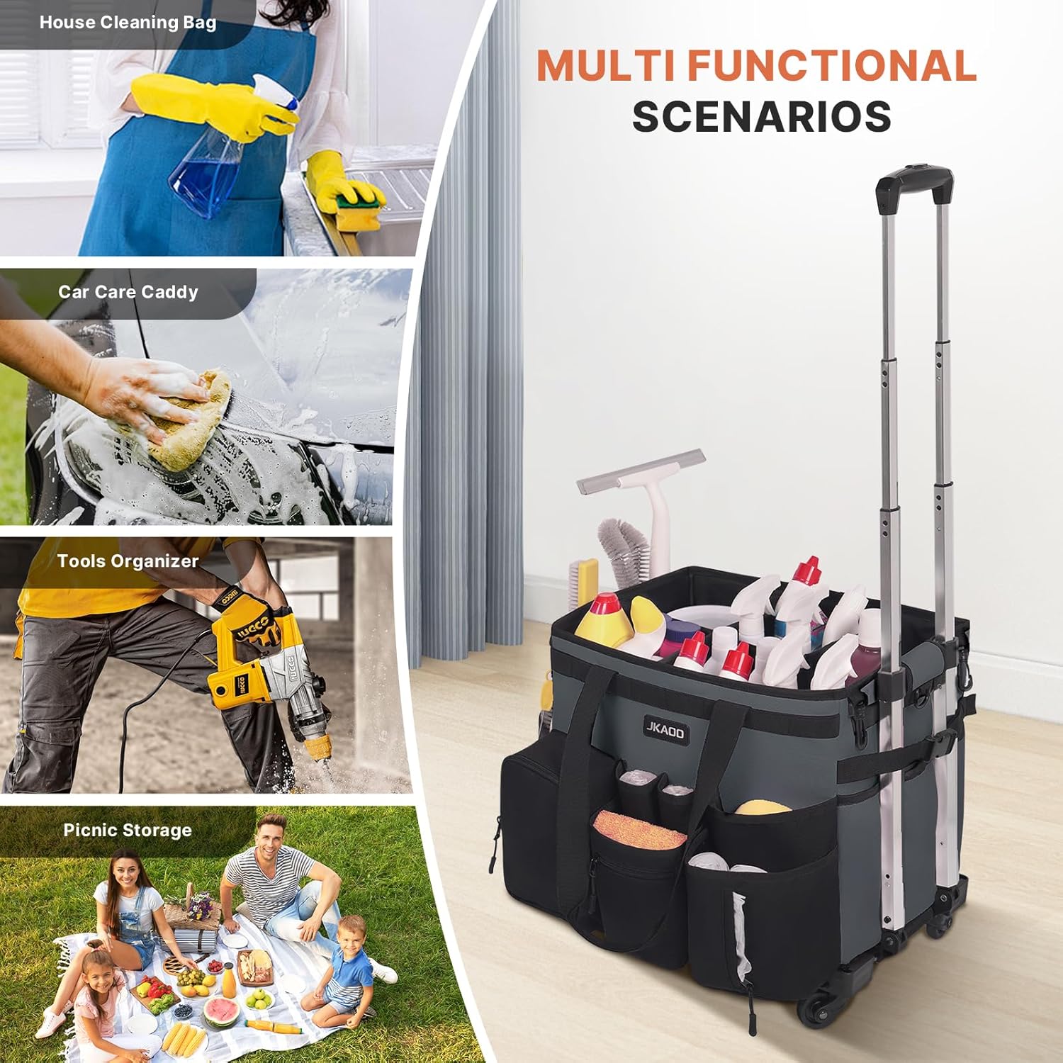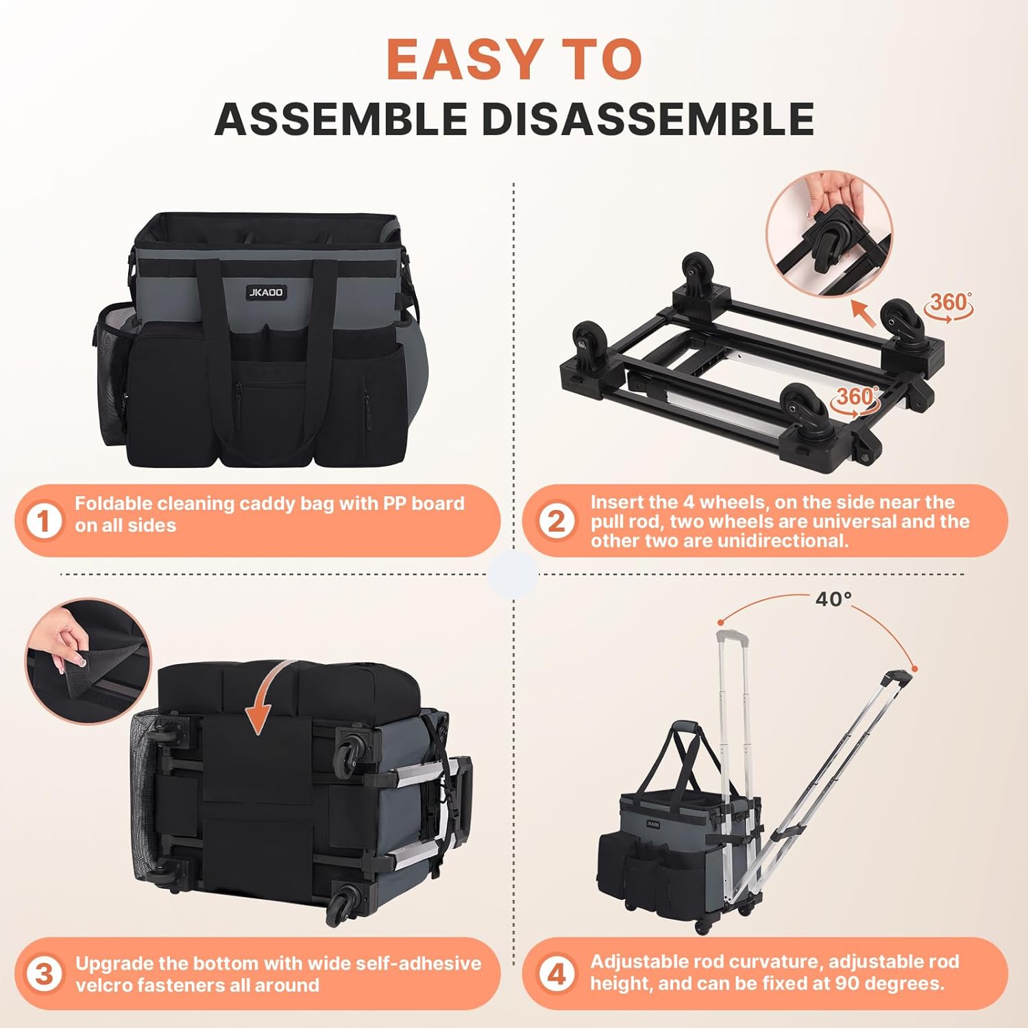 【90 °& 40 ° Adjustable Rolling Cleaning Caddy Bag】Rolling cleaning bag comes with 1 detachable shoulder strap and fixed double handles, both padded, it also comes with a detachable cart with 4 detachable inserted wheels (2 spinner wheels 360 °, 2 one-way wheels), and 2 extra wheels for later replacement. A 90 °& 40 ° adjustable pull bar is more agile than a traditional trolley and provides a more portable service