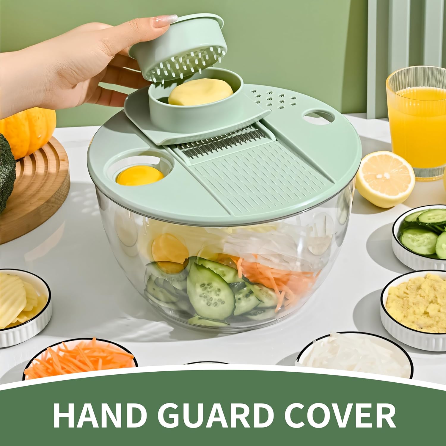 ALL-IN-ONE SALAD PREP TOOL: This 7-in-1 salad spinner is designed for maximum kitchen efficiency, combining a 5.3Qt wash bowl, strainer, lettuce dryer, grater, and 5 interchangeable slicer blades into one multifunctional unit. Ideal for rinsing, spinning, slicing, and shredding vegetables, fruits, and herbs—perfect for daily salad preparation or meal prep.