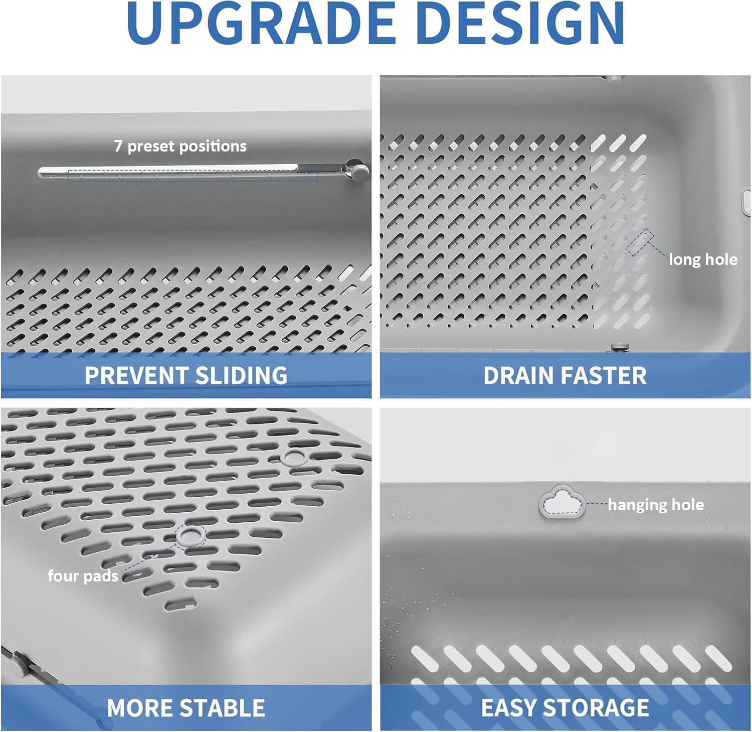LASSHSWA upgrade the colander, 7 preset positions – PREVENT SLIDING, long hole – DRAIN FASTER, four pads – MORE STABLE, hanging hole – EASY STORAGE.