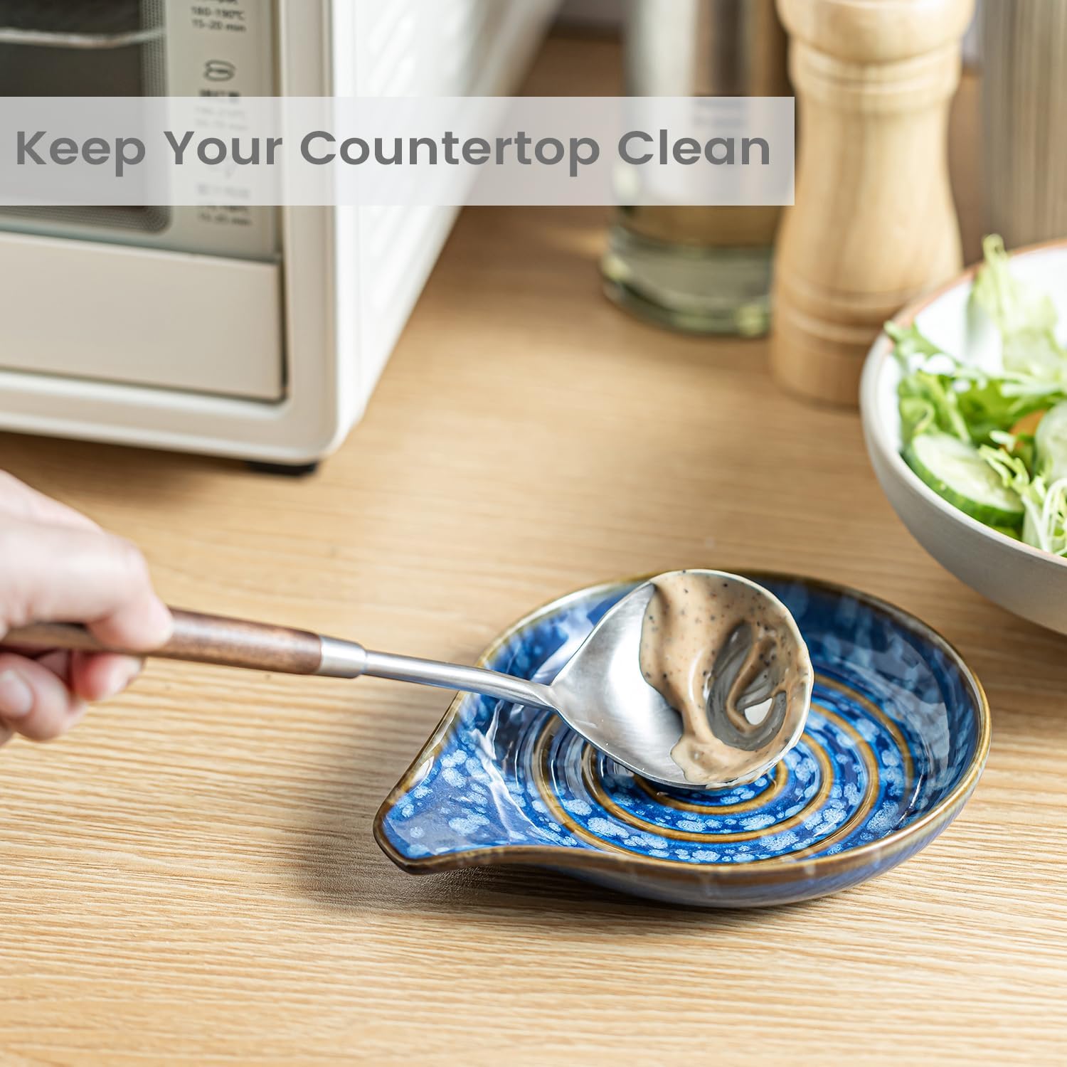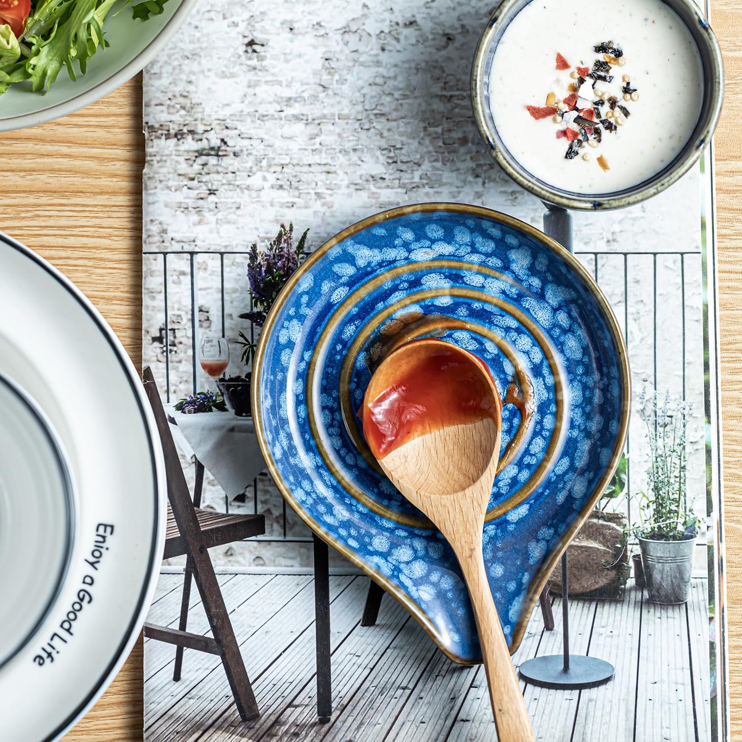 【Eye-Catching Design】This ceramic spoon rest features a stunning blue glaze with white speckles, creating a visually appealing and modern aesthetic. Its unique spiral pattern in the center adds a touch of artistic flair, making it a stylish addition to any kitchen