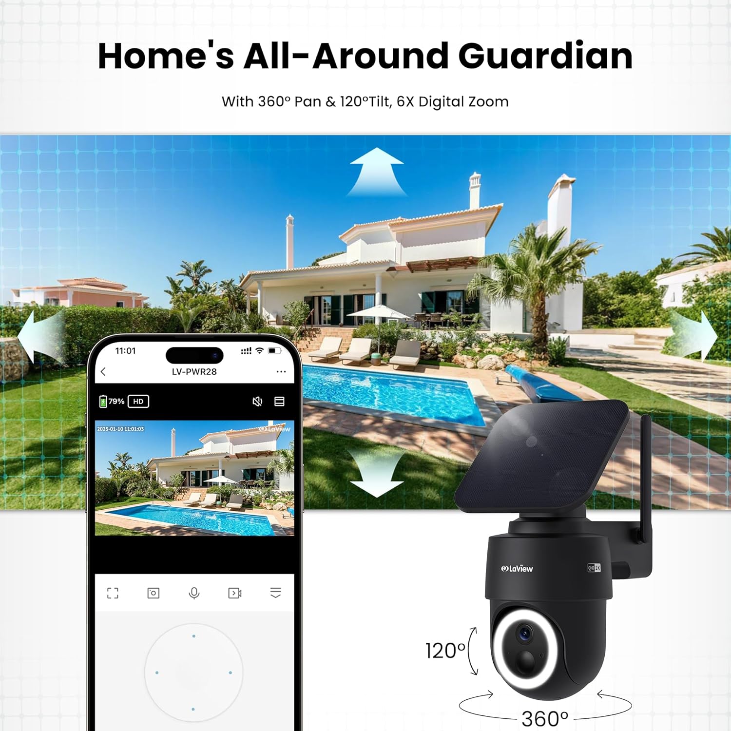 360° Pan & 120° Tilt, Full-Coverage: LaView 360° Pan & tilt outdoor camera allows control directly from your phone. Track and follow any movement for complete coverage—no blind spots. Perfect for monitoring your front proch, backyard, or driveway.