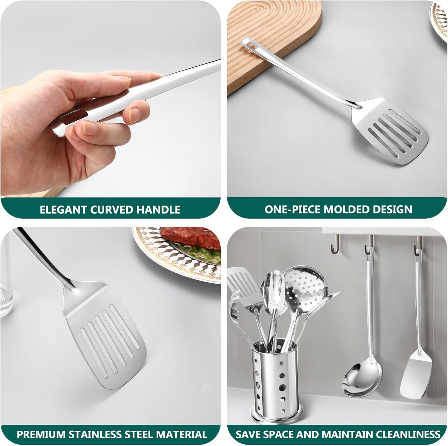 Premium Mirror Polished Stainless Steel & Heat-Resistant Design: Kitchen utensils set crafted from high-quality, food-grade stainless steel with a sophisticated mirror polished. The utensils are durable, rust-resistant, and feature thick, sturdy heads that won’t bend, ensuring even heavy-duty cooking is a breeze.