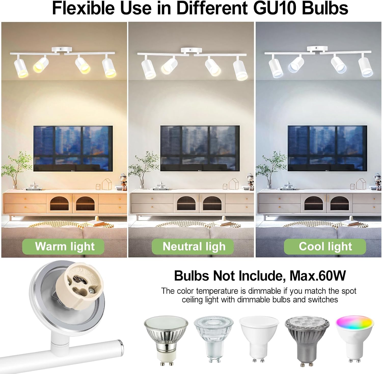 GU10 Socket: Karyoosi track lighting fixture features a standard GU10 bulb socket (bulb not included). It is compatible with common LED or halogen bulbs, with a maximum power of 60W per GU10 bulb. Additionally, you have the option to choose dimmable bulbs or smart bulbs to cater to various lighting atmospheres