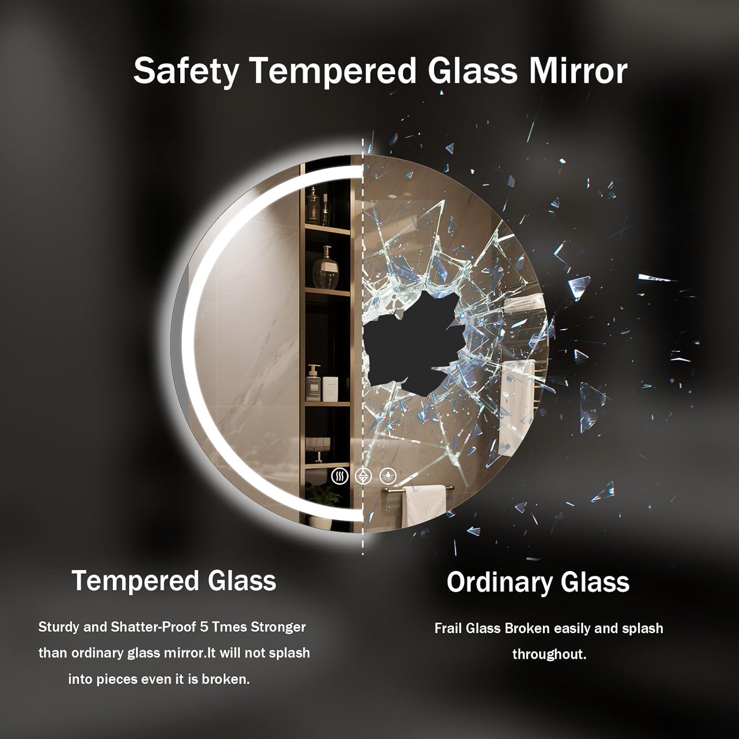 【Adjustable LED Light Strip】: The Round Bathroom Mirror with Lights made of Tempered Glass features multiple brightness levels, catering to various needs like makeup application, skincare routines, and more, emphasizing its practicality and versatility.