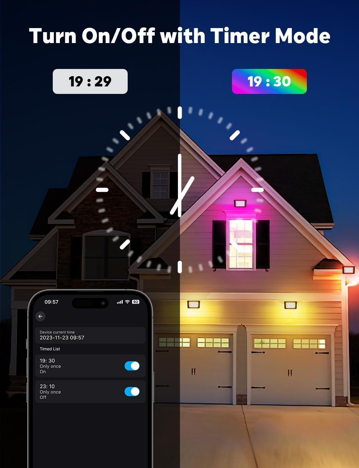 【Music Sync & Timing Function】Our Smart RGB outdoor lighting can change colors according to rhythm of music melody, you can choose dynamic or soft music according to your preferences to experience the changes in lighting and enjoy it., so it can used for stage lights, led up lights, landscape lighting, backdrop lighting, Christmas lights and garden lights. And the patio lights built-in newly developed timing chip, allows you to schedule when the lights turn on and off, which can enhance convenience and save energy costs. In short, this outdoor LED flood light is definitely a great invention.