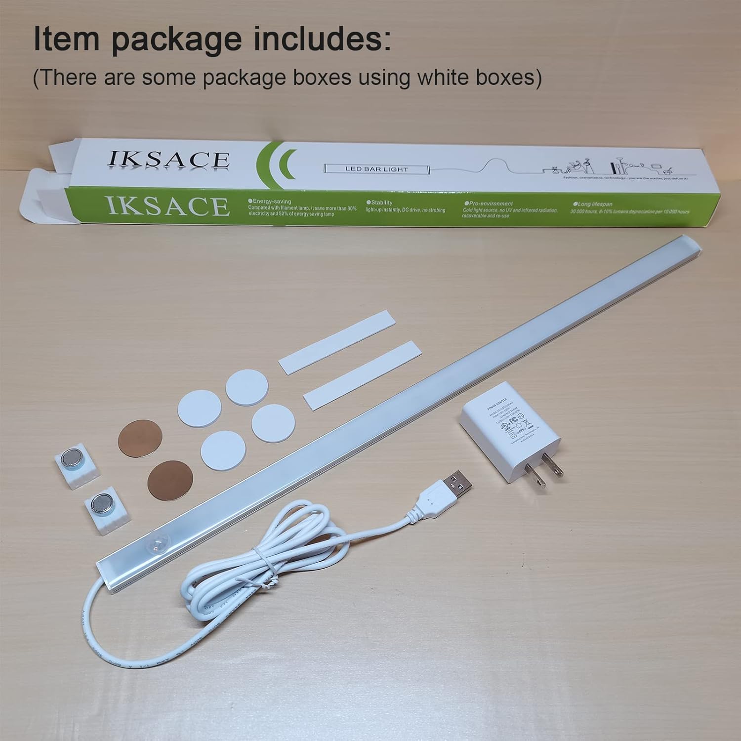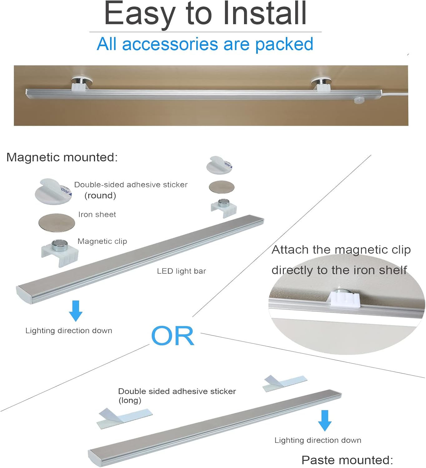 Package Includes: 1 x 17 inch 4000K Motion Sensor Activated LED Light Bar (with USB cable) 1 x USB Powered Adapter Plug (UL Certified) 2 x Magnetic Clips 4 x Double Side Stickers (Round) 2 x Double Side Stickers (Long)